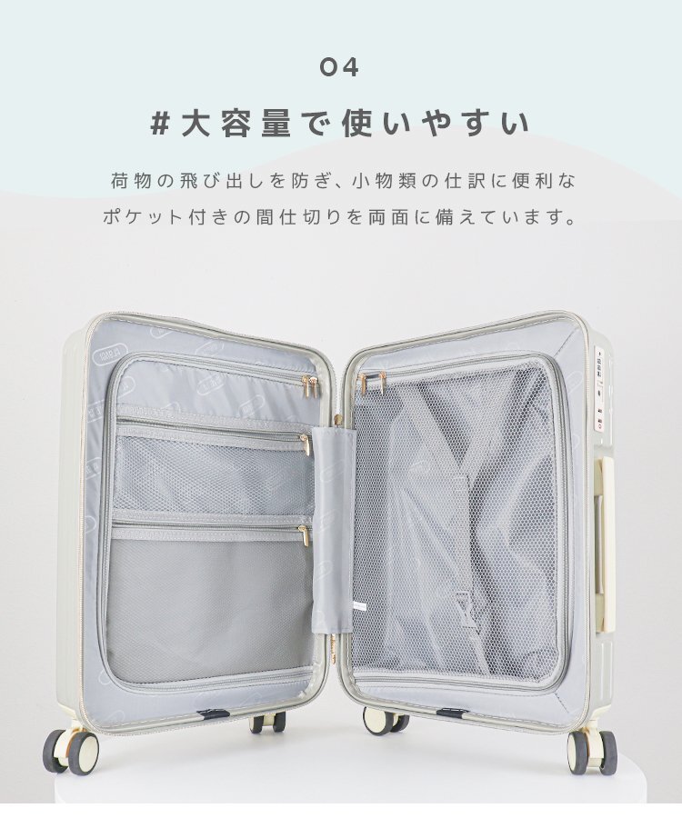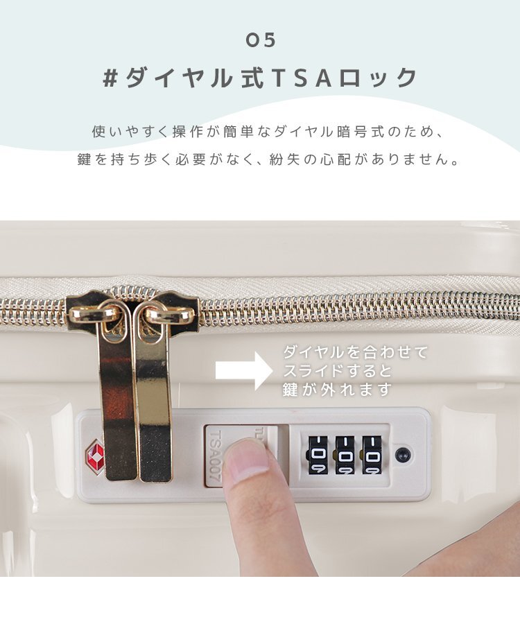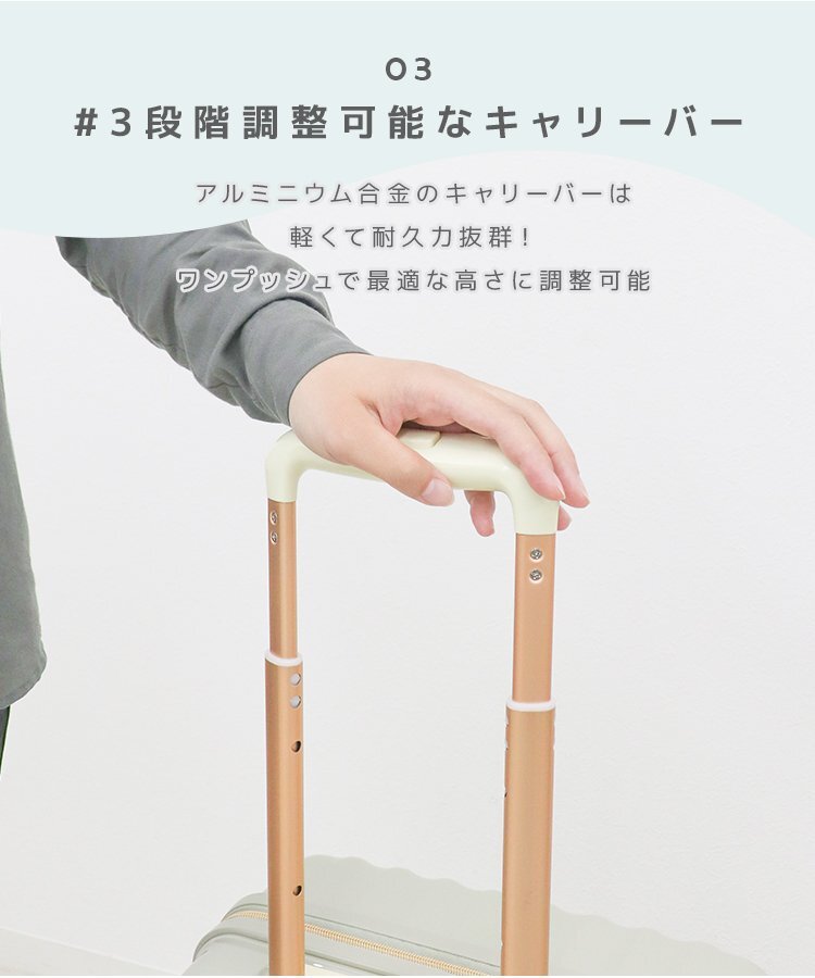 | 持ち運びしやすい軽量スーツケースです。 人気のパステルカラー6色展開! 高耐久、高品質のABS+PC素材を使用。 海外旅行でも安心して使える抜群の耐衝撃性で長くご使用いただけます! キャリーバーは使い勝手や身長に合わせて3段階の高さ調整が可能です。 スーツケースの中はやクロスベルトで荷物の飛び出しを防ぎ、 小物類の仕分けに便利な通気性の良いメッシュポケット付きです♪ 施錠は操作が簡単なダイヤル暗号式! 鍵を持ち歩く必要がなく、紛失の心配もなし! また、世界基準施錠TSAロック搭載! 全世界施錠した状態で荷物を預ける事ができます。 【商品仕様】 サイズ(約): ・外寸 40×23×62cm ・内寸 59×39cm 重量(約):3.7kg 容量(約):60L 素材:アルミ合金 他 【注意事項】 ・TSAロック方式の商品には、鍵穴が付いていても鍵は付属しておりません。 (検査時に空港のTSA職員が専用の鍵で開錠するためのものです) ・商品はモニターによって色合いが異なって見える場合があります。 ・仕様/デザインは改良のため予告なく変更することがあります。 |