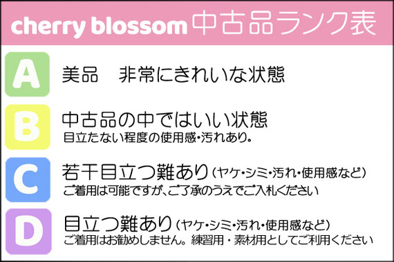 | 当店の中古商品の商品ランクはA~Dの4段階になります。 以下の表をご覧の上ご判断いただきますようお願いいたします。 ※十分な検品の上商品のランクをつけさせていただいておりますが、 見落としによるシミや汚れがある場合がございます。 ご落札の際は、その点をご確認の上ご入札いただきますようよろしくお願いいたします。 ![]() |