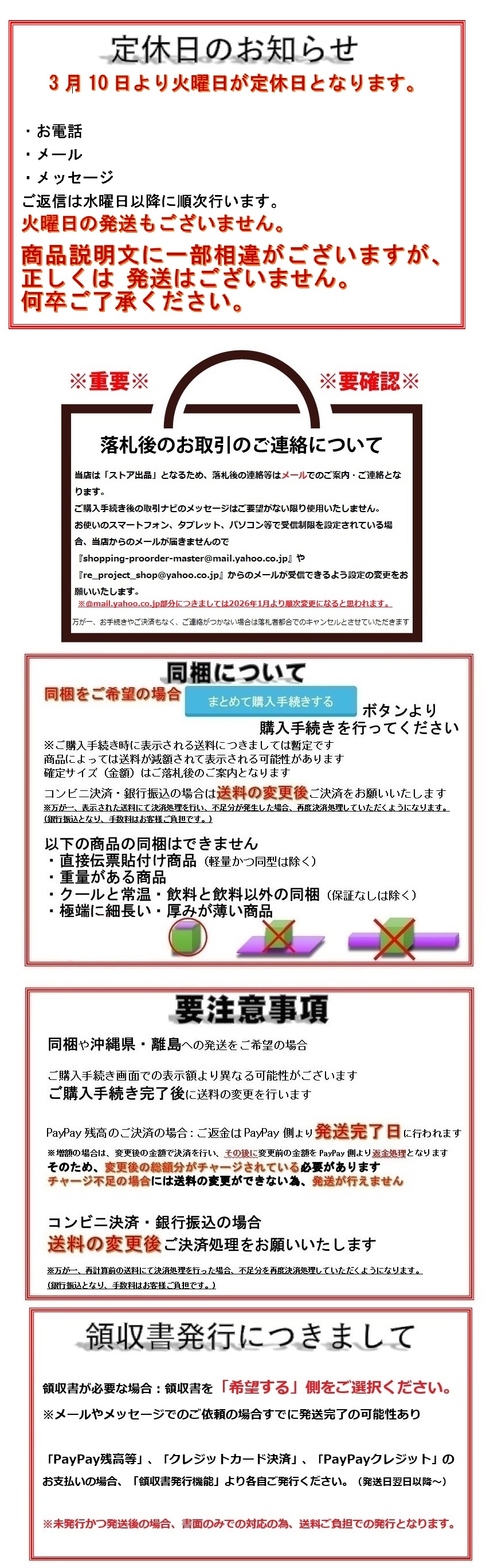 ※同梱可能商品に限ります。 定形郵便や定形外郵便(規格内)と定形外郵便(規格外)の同梱(定形外郵便発送)につきましては 佐川急便をご選択の上、ご要望欄に定形外郵便発送希望とご入力ください。 ご購入手続きが完了ののち、当方より手動で『お支払い総額のご案内』と『送料の変更』をいたします。 ご決済時の注意事項は下記をご高覧願います。 ◆沖縄県・離島への発送、同梱希望の場合のご決済について ■クレジットカード決済、PayPayクレジット 再度オーソリゼーションが行われます。 万が一、通らなかった場合は銀行振込となります。 ■銀行振込の場合 ご案内前の内容ではご決済しないようにお願いいたします。 万が一、不足金額にてご入金いただいた場合、不足分の追加入金の確認ができるまで商品の発送ができませんのでご了承ください。 超過分につきましては、銀行振込にて手数料を差し引いてのご返金となります。 ■コンビニ決済の場合 (※12月はご利用できません) 再度お支払番号を発行いたしますので、新たなお支払番号にてご決済ください。 ■PayPay残高等払いの場合 ご購入手続き時の表示金額より減額・増額により、お手続きが異なります。 減額となる場合: 発送完了日にPayPay側より返金処理となります。 増額となる場合: 変更後の金額で決済を行い、 その後に変更前の金額をPayPay側よりご返金処理となります。 ※増額となる際にチャージ不足の場合には、送料の変更ができない為、発送が行えません。 不足額のみのご決済はYahoo!オークションシステム上、銀行振込のみ対応可能です。 Yahoo!ショッピングヘルプ PayPay残高等払いについて(旧名称:PayPay残高払い・PayPay(残高)) https://support.yahoo-net.jp/PccShopping/s/article/H000011025#changeamount ◆普通郵便でのオプションについて