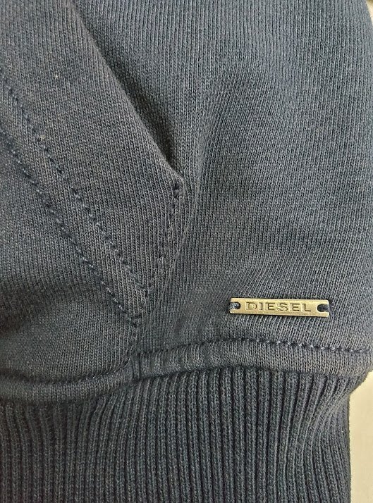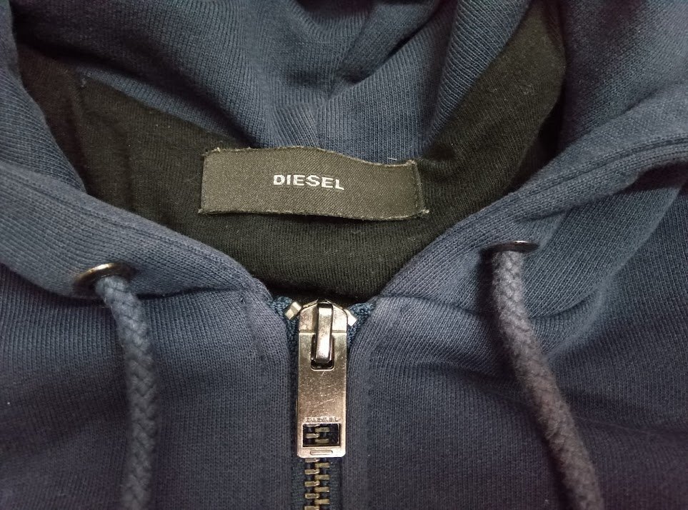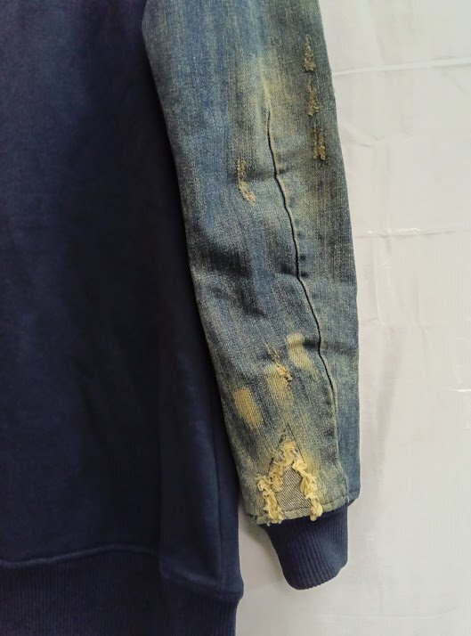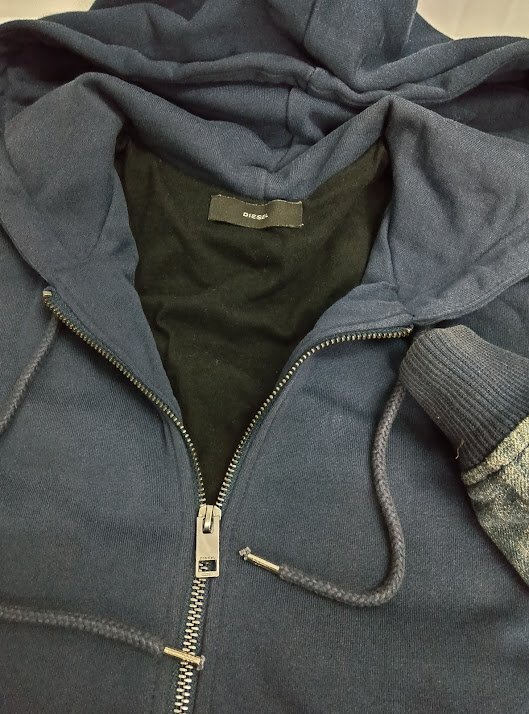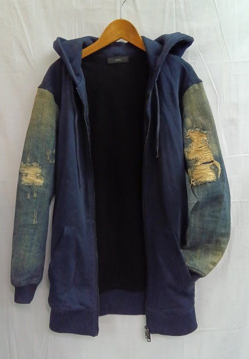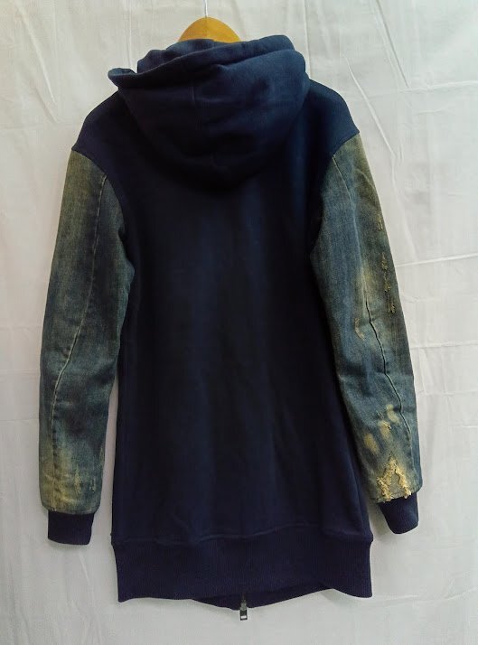 DIESEL☆ディーゼル デニム 切替 パーカー メンズ XS ネイビー/インディゴ ダメージ加工 フーディ スウェット ジャケット【中古】Y251213015