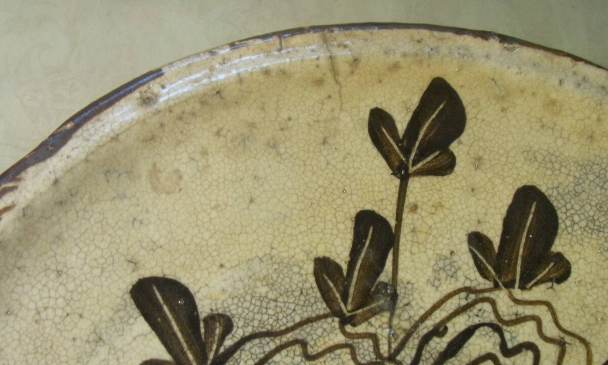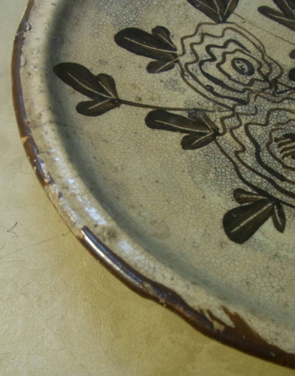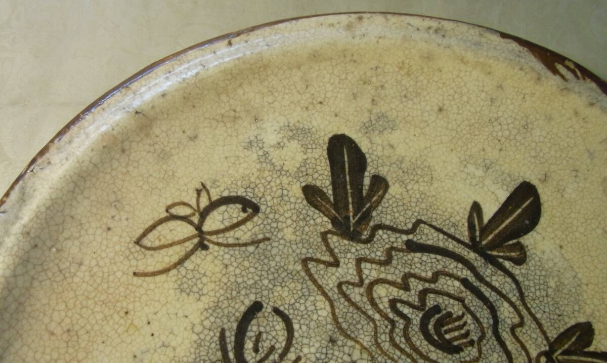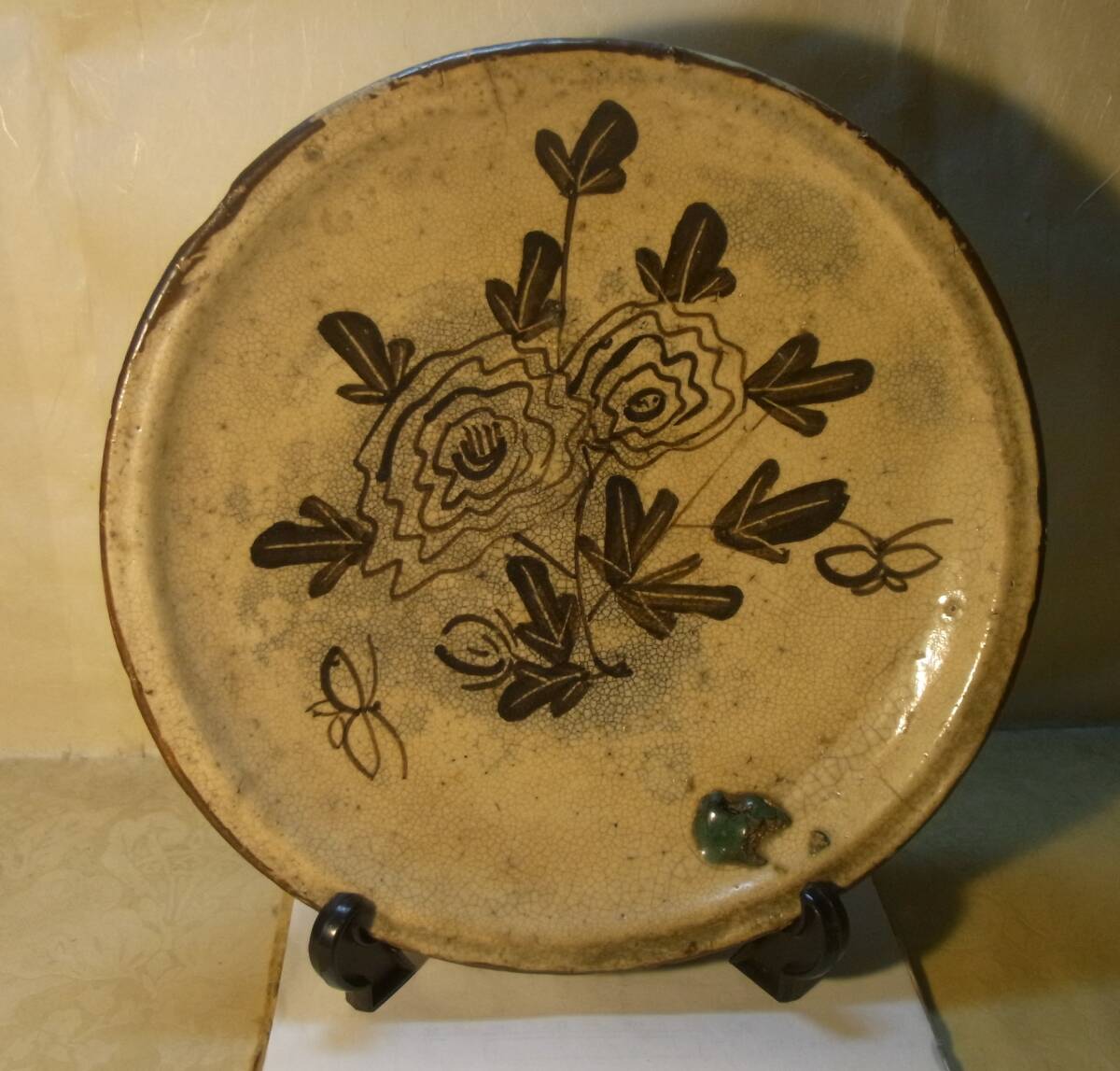 大きさは、径25センチ、高さ4センチです。表面にモダンな図柄の花柄や、蝶などが描かれた素晴らしい絵皿です。なお、古いものですので、縁の所に、2か所、細いニューがあり、また、表面に緑釉の塊りのひっつき、そして、裏側には、制作時のものと思われる釉カケのような跡があります。従って、全体の状態などは、画像から判断してください。皿立ては付いていません!