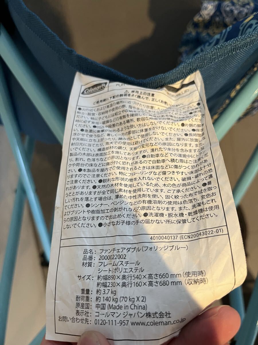 コールマンのファンチェアダブル(フォリッジブルー)です。現在は廃盤となっているため、希少価値の高いアイテムです。