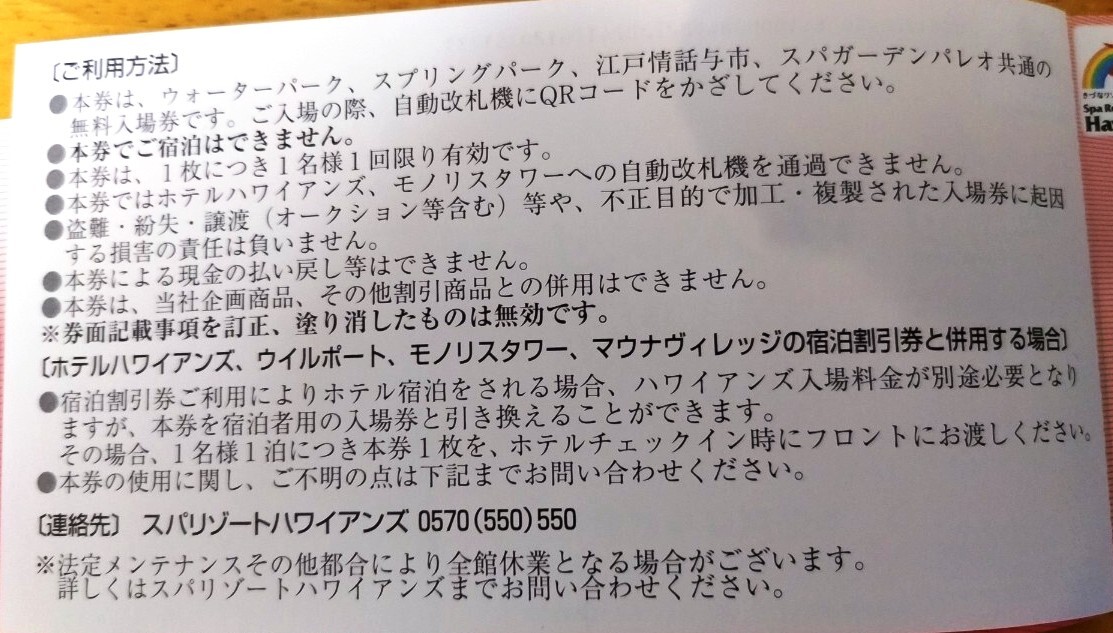 ●ハワイアンズ施設入場券は、ウォーターパーク、スプリングパーク、江戸情話与市、スパガーデンパレオ共通の無料入場券です。