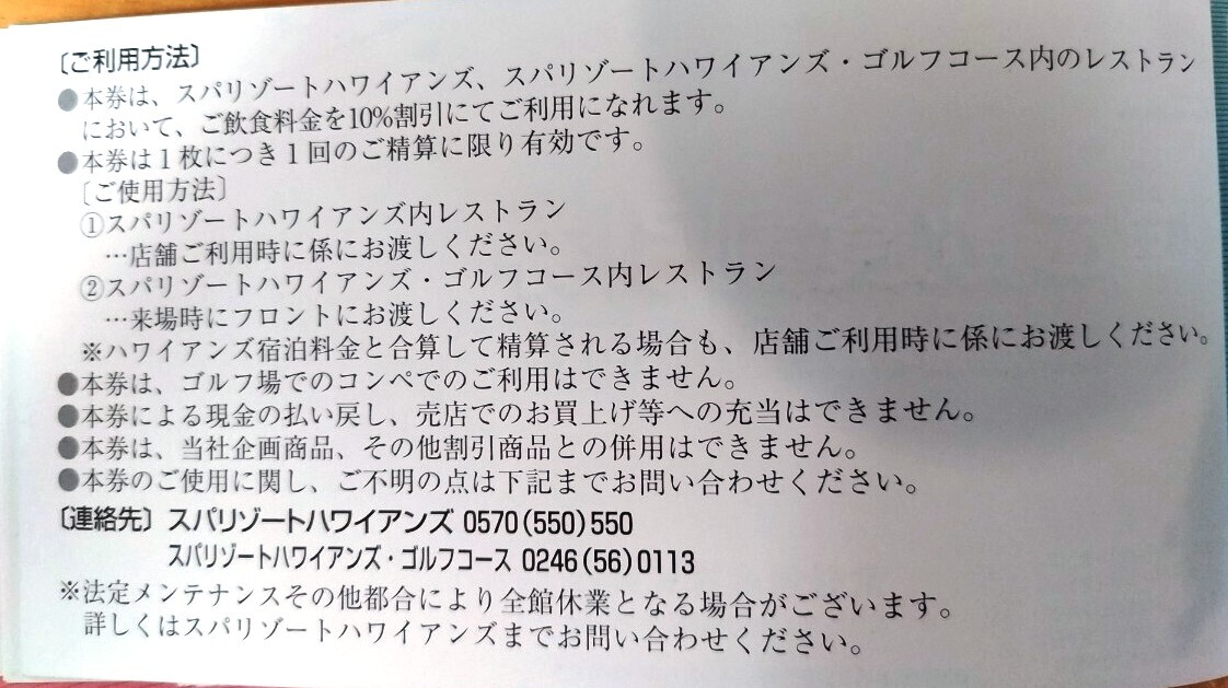 ●ご飲食割引券は、スパリゾートハワイアンズ、スパリゾートハワイアンズ・ゴルフコース内レストランでご利用になれます。