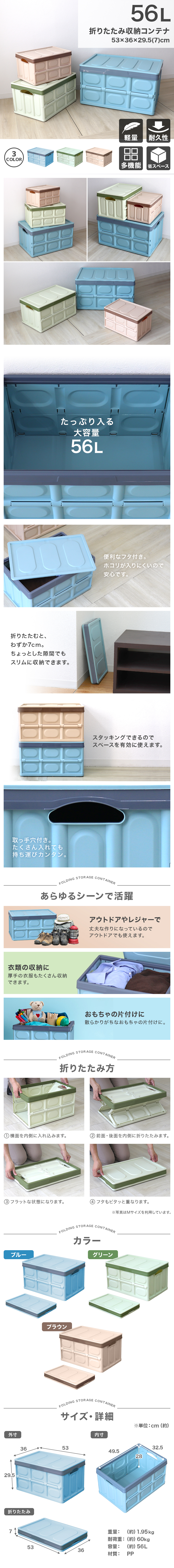 たっぷり入る56Lの大容量! 衣服や子供のおもちゃの収納や、 丈夫なつくりになっているのでアウトドアでも大活躍! 便利なフタつきなのでホコリが入りにくい! また、側面には取っ手穴が付いているので持ち運びもラクラク♪ 使わないときはコンパクトに折りたたんでおけます。 折りたたむと、わずか10cm! ちょっとした隙間にスリムに収納できます。 落ち着きのあるカラーなので、インテリアとしてもお部屋に馴染みます。 【商品仕様】 カラー:ブルー サイズ 外寸(約):幅53×奥行き36×高さ29.5cm 内寸(約):幅49.5×奥行き32.5×高さ28cm 材質:PP 重量(約):1.95kg 耐荷重(約):60kg 容量(約):56L |