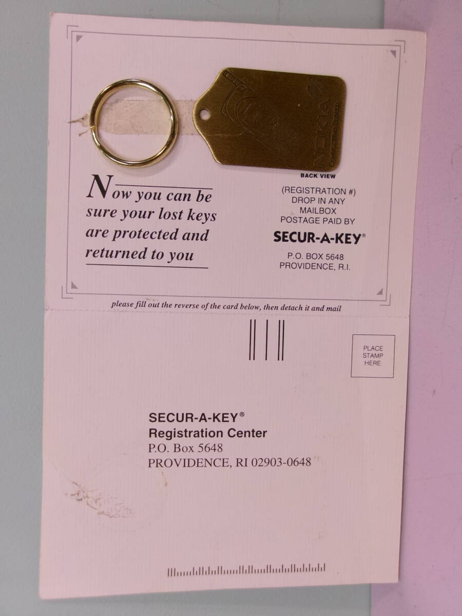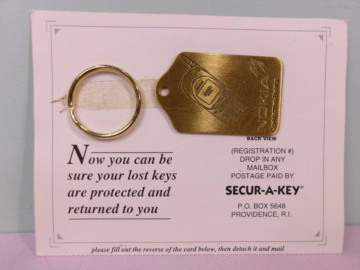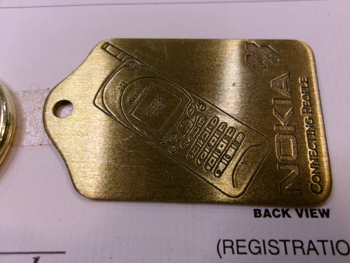 金属プレートの大きさ約5.5cm四方、90当時年代当時のノキアの携帯が刻印されたキーホルダーです。