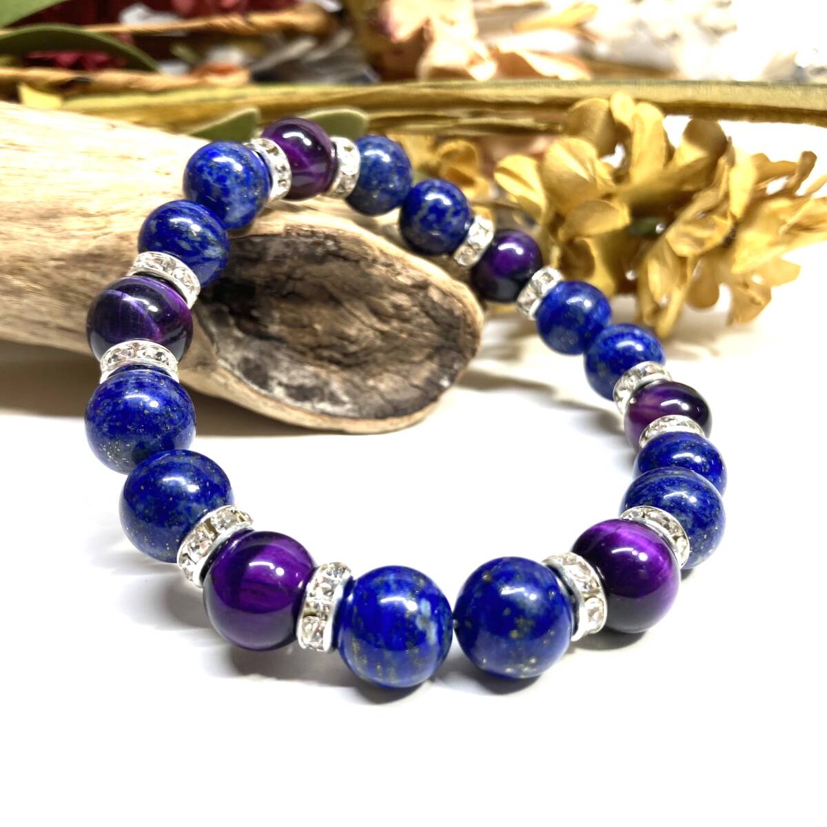 こちらは、ラピスラズリとパープル タイガーアイを組み合わせたパワーストーンブレスレットです。間にはロンデルを挟み高級感あるデザインに仕上げております。石大きさは腕にも馴染みやすいように10mm玉で内径約18cm(伸可能)です。(サイズ変更の場合は取引ナビにてご連絡をお願いします。) 数に限りがございますので気になる方はお早めにどうぞ。