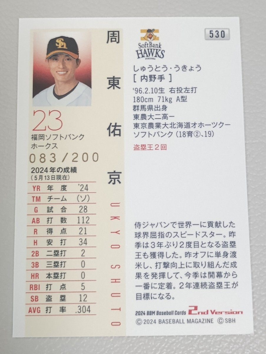 【200枚限定】BBM 2024 ベースボールカード 2nd VERSION バージョン 周東 佑京 パラレル ソフトバンク ホークス