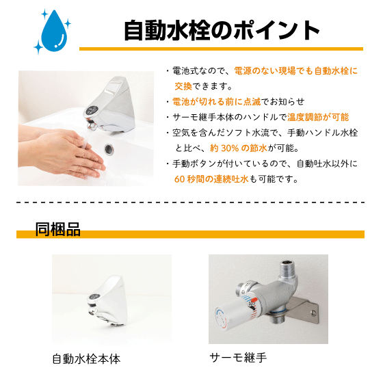 ・ 水栓に直接触れないで手を洗うことができるため衛生的で、また感染症予防にも効果的です。