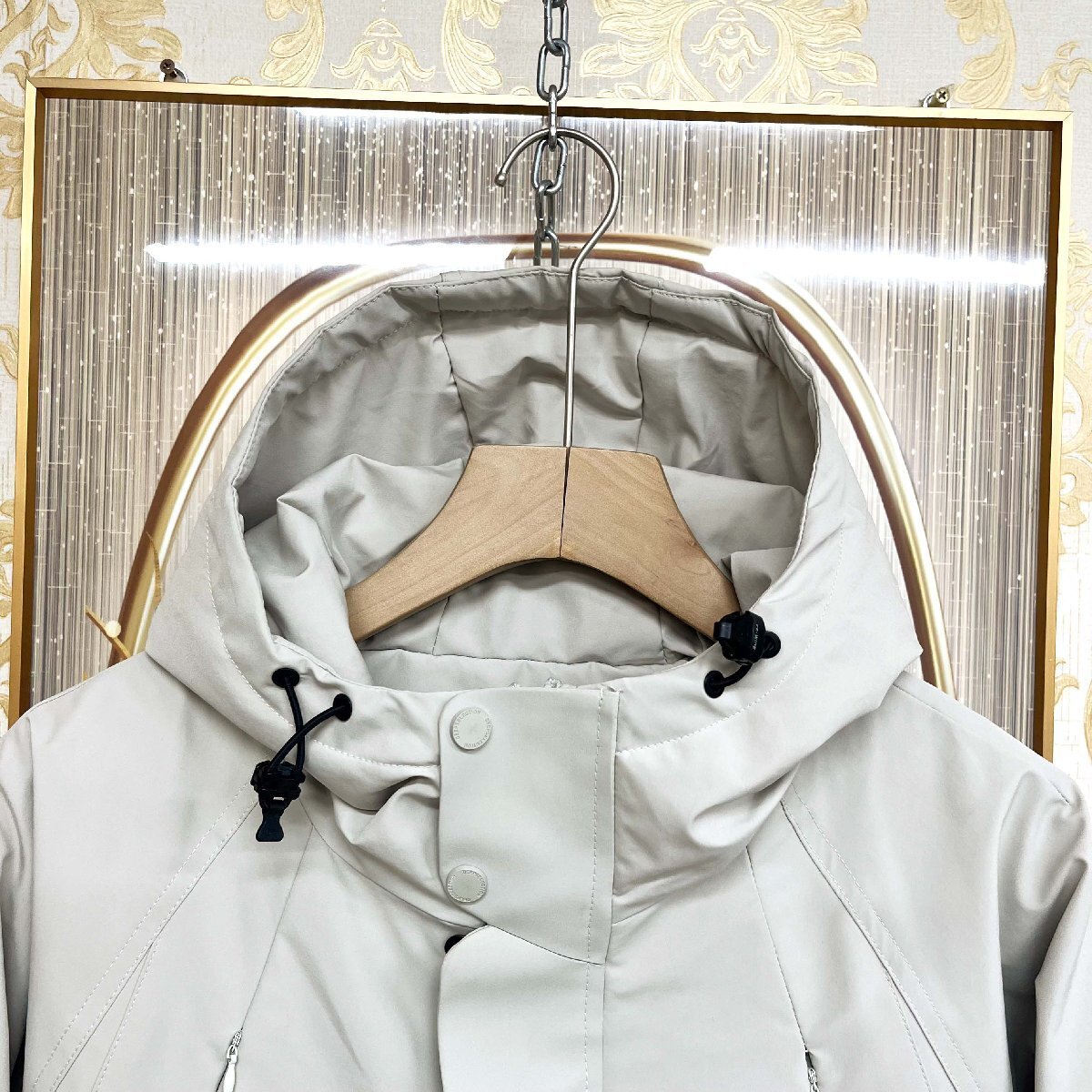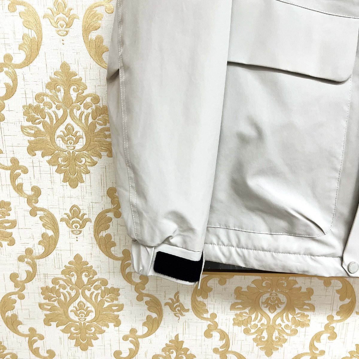 胸元には小さなファスナーポケットを配置し、アクセントとしても実用面でも便利。立ち襟に加えてフードを備え、首まわりの防風性を高めています。フードと裾にはドローコードを搭載し、シルエットやフィット感の調整が自由自在。袖口はマジックテープ仕様で風の侵入を防ぎながら、自分好みのフィットに調整可能。5つのポケットを配置し、前側のポケットはすべてファスナー付きで貴重品の持ち歩きも安心です。