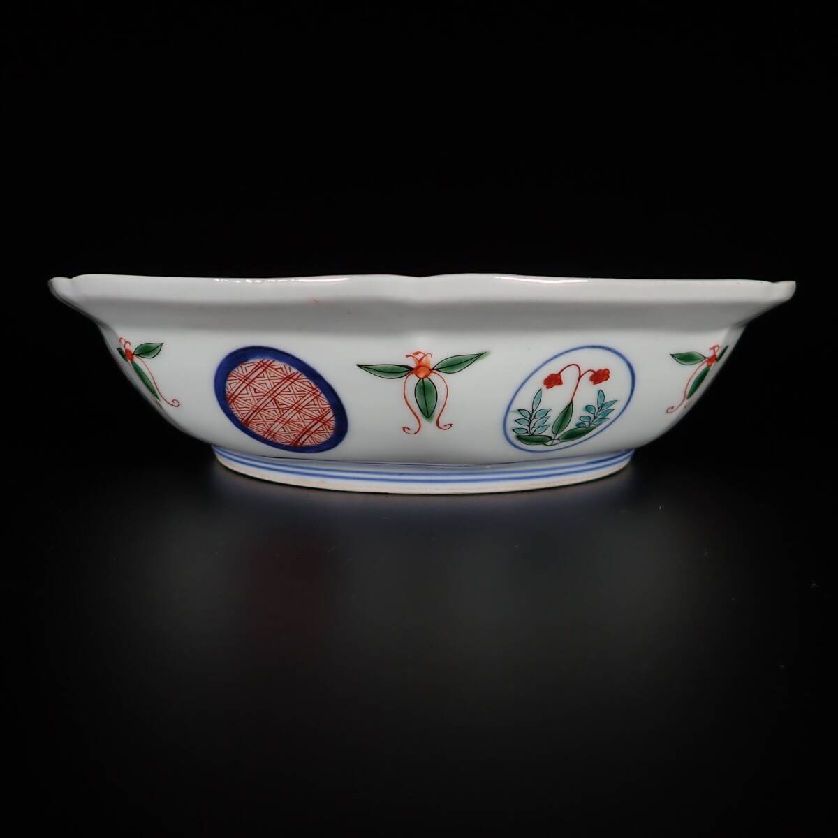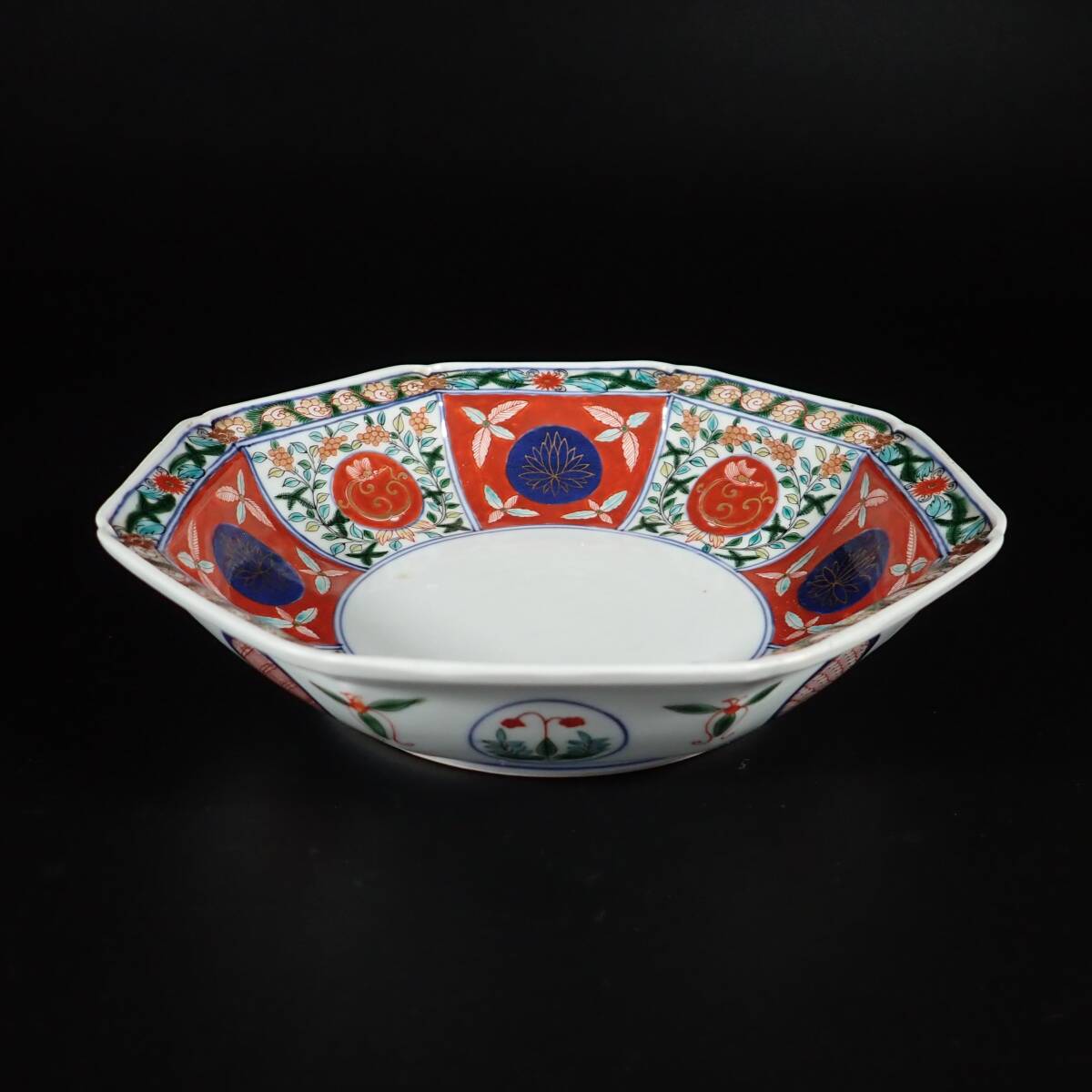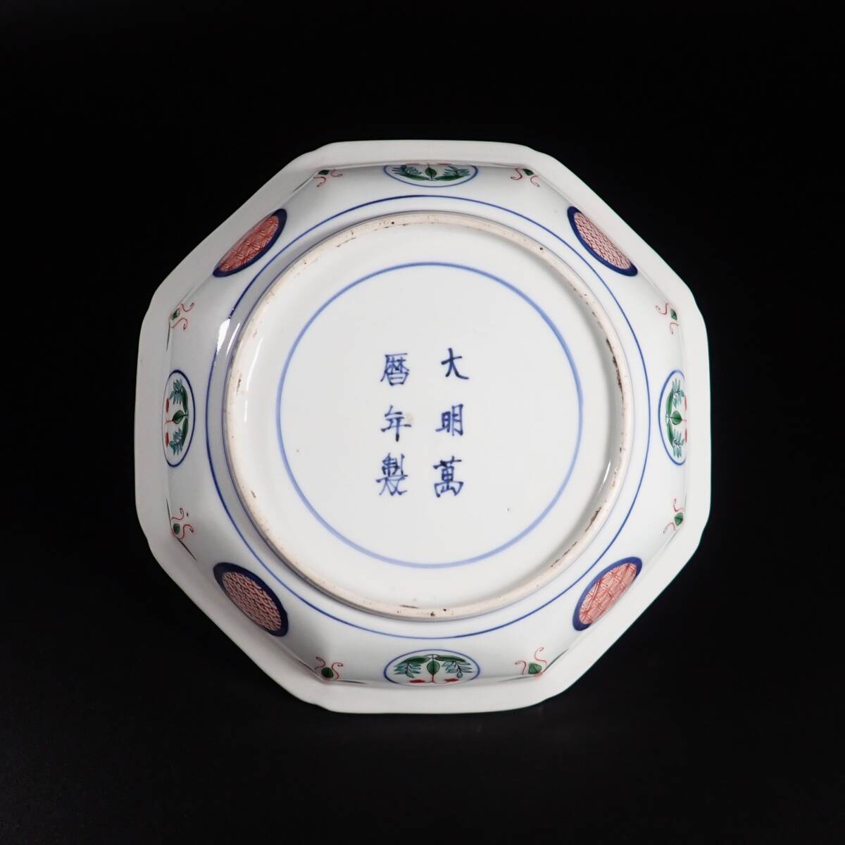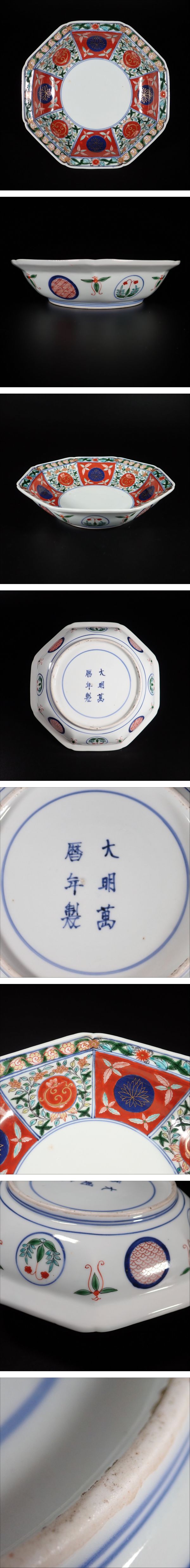 ■ 商品説明 八角形の器形に、赤・緑・藍を基調とした色絵で丸紋文を配した一品です。 各面ごとに文様を区切り、丸紋や草花文をリズミカルに配することで、全体に安定感のある構成となっています。 赤絵の発色も良く、余白を残した見込みとの対比が美しい仕上がりです。 縁まわりまで丁寧に描き込まれており、古伊万里色絵らしい華やかさが感じられます。 裏面には大明萬歴年製の銘と丸文と花文が丁寧に描かれております。 |