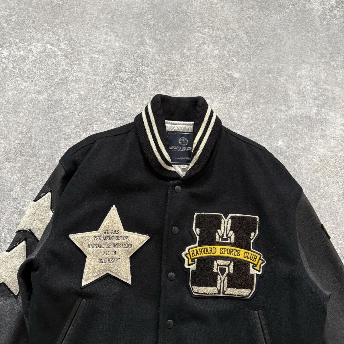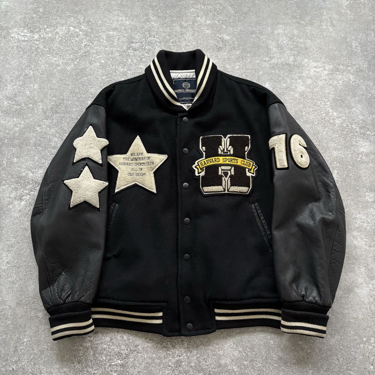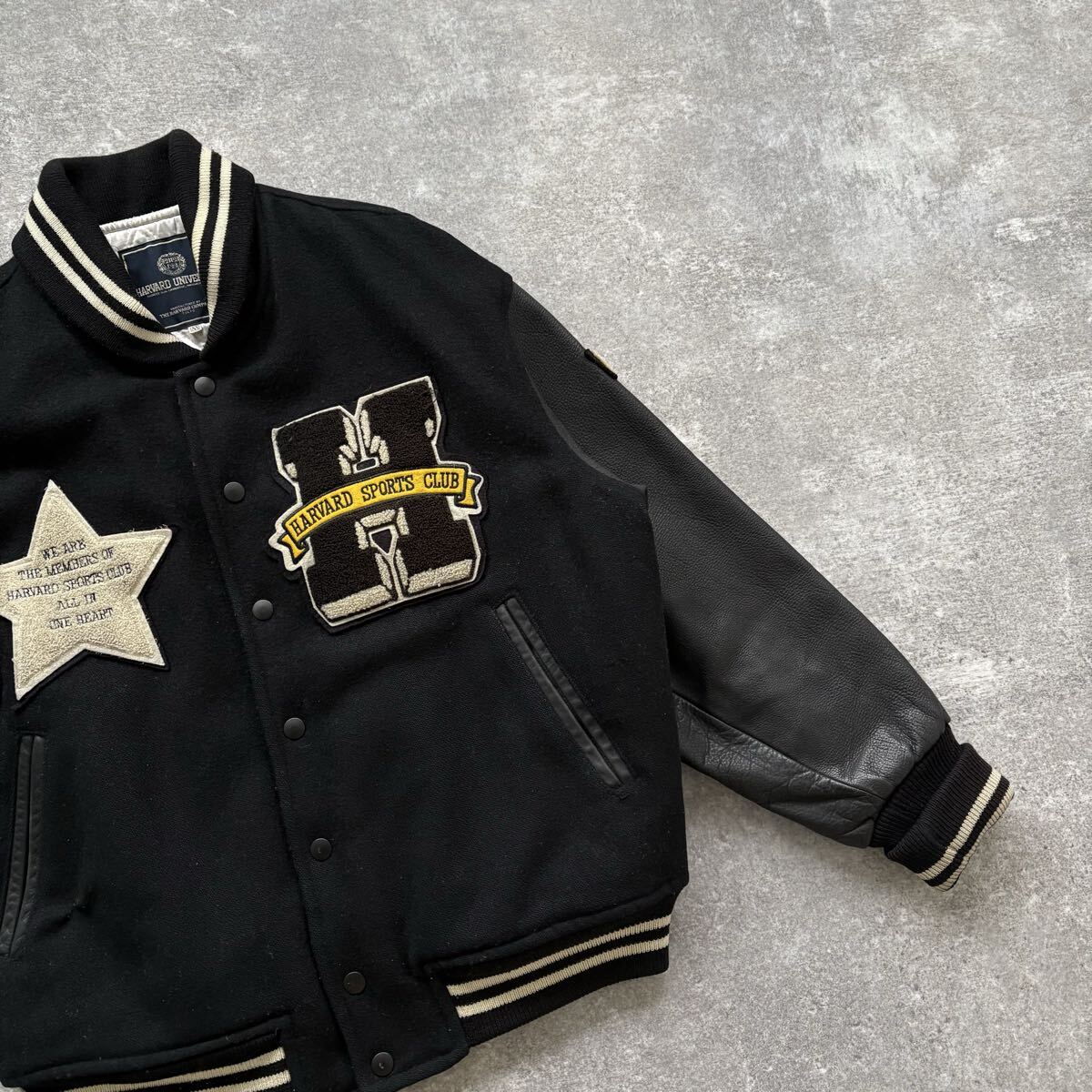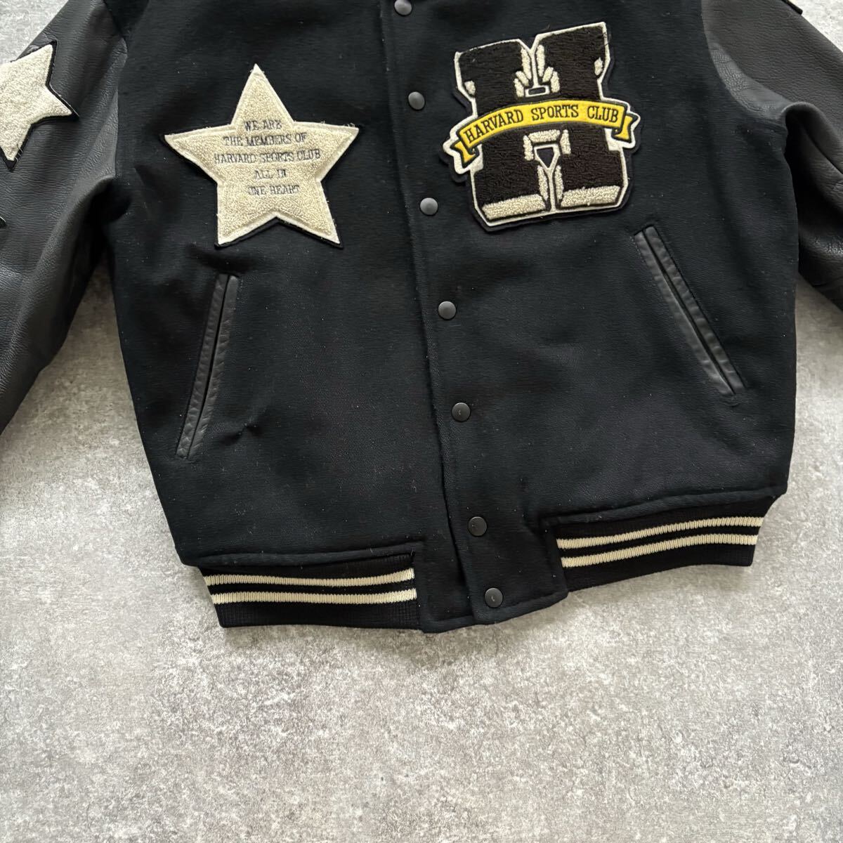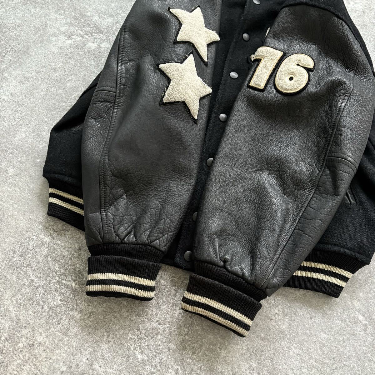 ウールボディにレザースリーブ、中綿入りで作りも重い。当時は完全に「高級スタジャン」の部類。