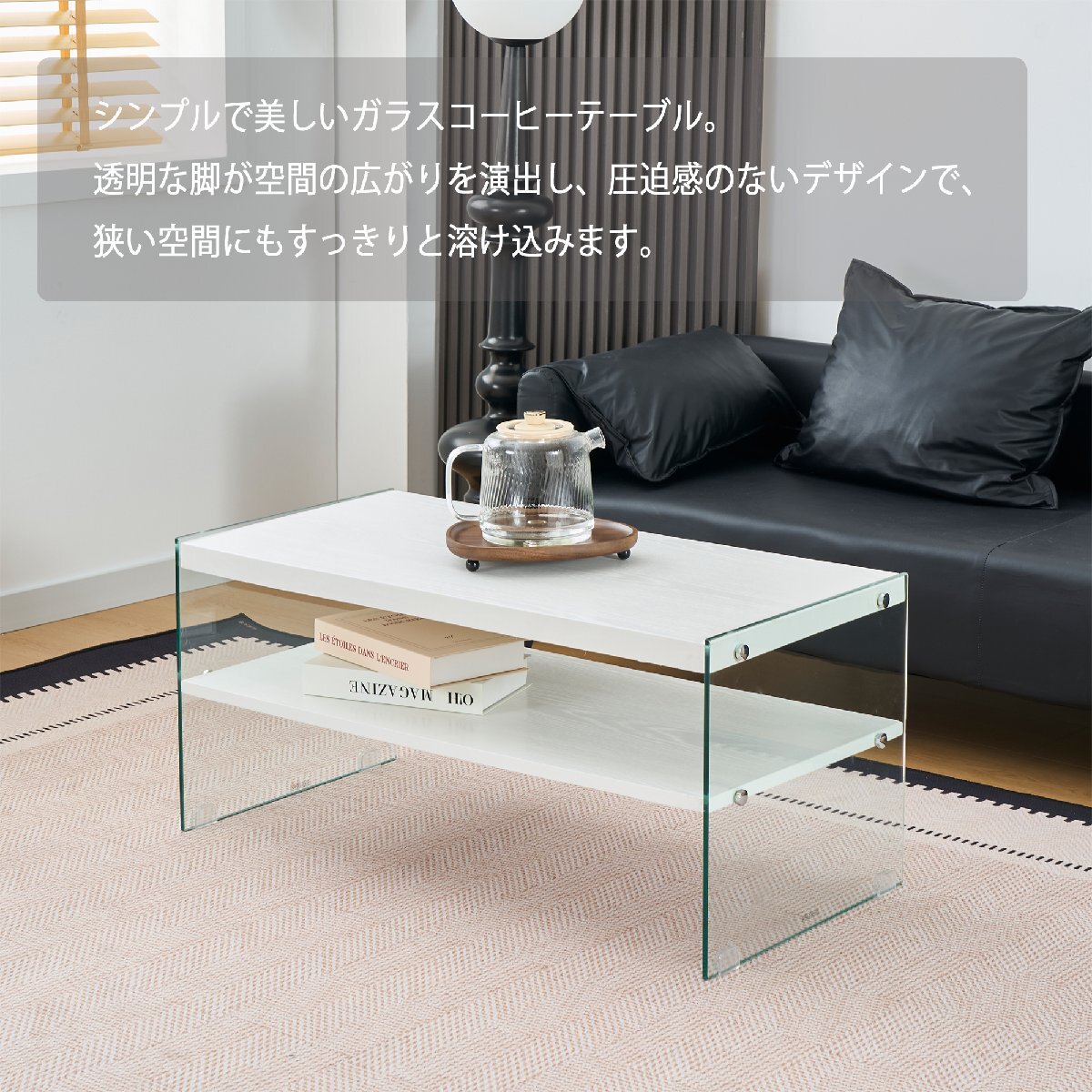【国内発送】リビングテーブル センターテーブル コーヒーテーブル ローテーブル 収納 モダン長方形MDF天板×強化ガラス脚 ホワイト