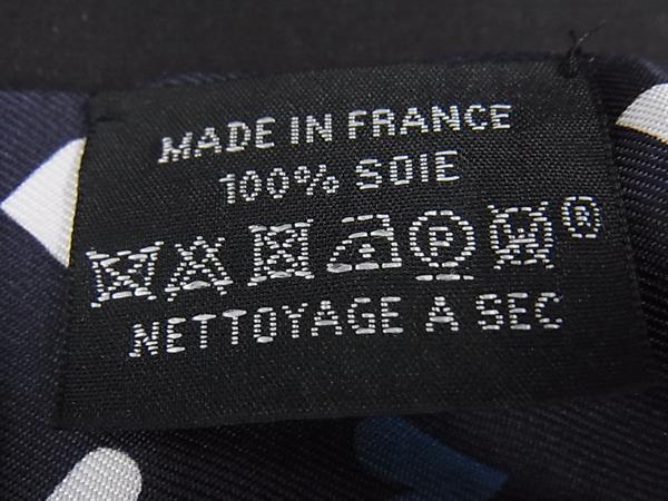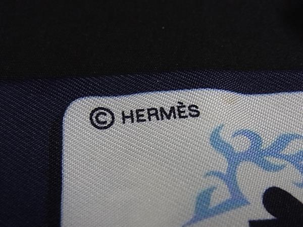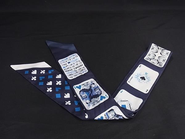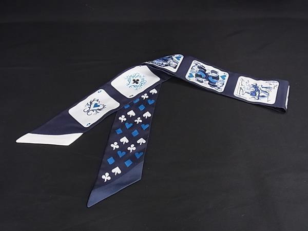 1円 HERMES エルメス Jeu De Cartes【ジュドーカルト】ツイリー シルク100% トランプ柄 リボンスカーフ レディース ネイビー系 FR7254