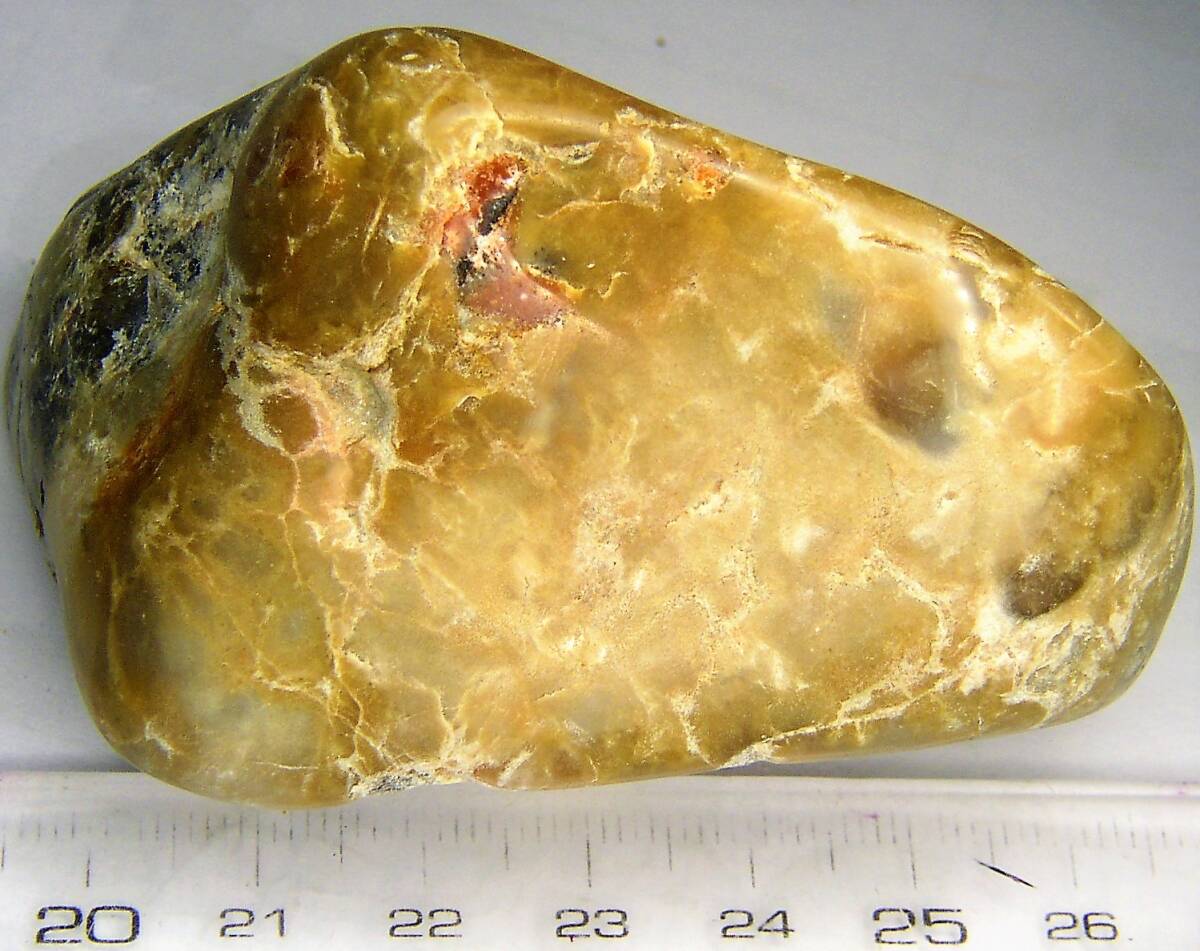 ジュラ紀(約2億年~1億5千万年前)の草食恐竜の糞が珪酸に置きかえられ瑪瑙化している糞石(コプロライト)の表面を磨いたものです。研磨面顕微鏡で覗くと未消化の花粉化石が観察できる場合があります。産出地はUtah,U.S.A。入手時のラベル付、恐竜の糞化石説明書付(第6回東京国際ミネラルフェアコピー)。