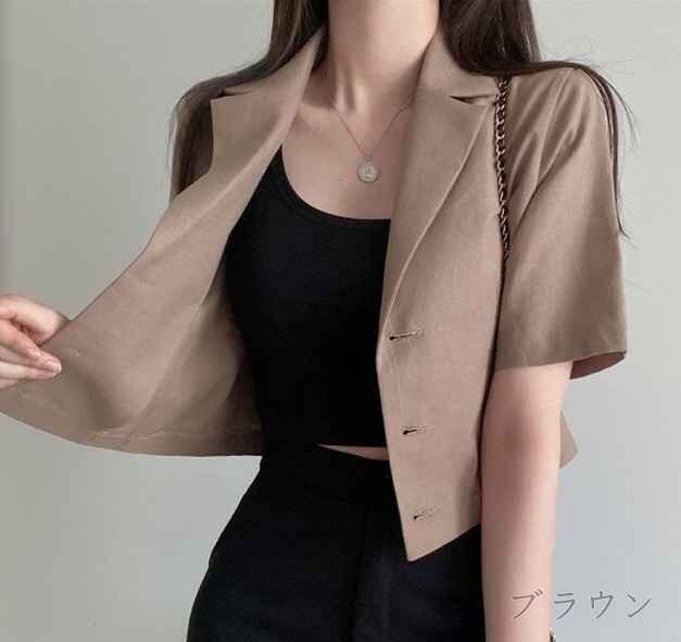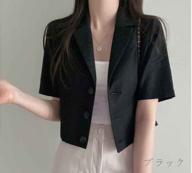 全3色 ブレザー ショート丈 半袖 切り替え 体型カバー 着痩せ 無地 【大きいサイズあり】 2XL ブラック