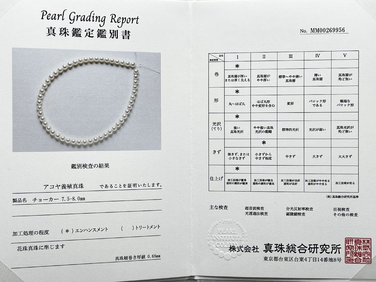 1円 真珠総合研鑑別書 準花珠 ネックレス 7.5-8.0mm アコヤ真珠 あこや Pearl necklace 照り強 本真珠 【1961225-1211】