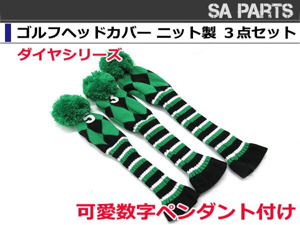 『ゴルフヘッドカバー 3点セット』ボンボン ニット製 星条旗柄 ダイヤ柄 可愛い 数字ペンダント付け クラブ 保護 #1 #3 #5 グリーン