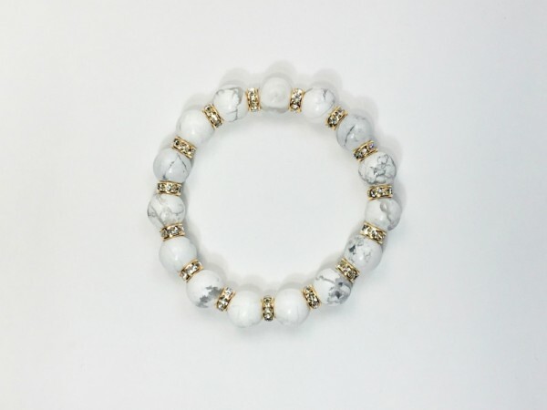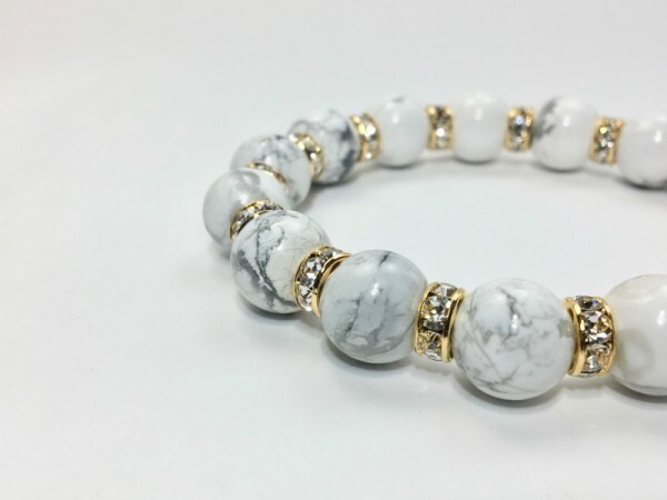 こちらは、12mm玉のハウライトを使用した天然石ブレスレットです。石との間にはロンデルを挟み高級感を演出しています。シンプルなデザインですのでどんなコーディネートとも合わせ易いブレスレットです。石大きさは12mm玉です。内径約18cmです。(サイズ変更の場合は取引ナビにてご連絡をお願いします。) 数に限りがございますので気になる方はお早めにどうぞ。