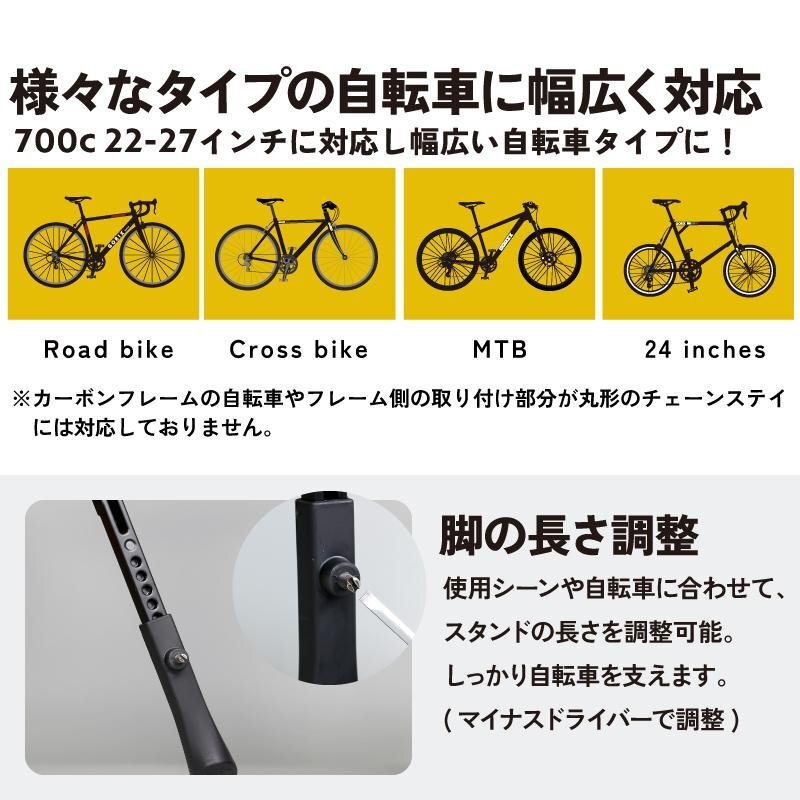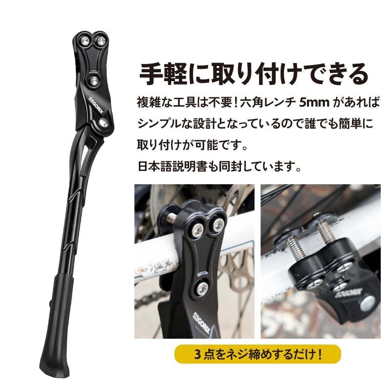 GORIX 自転車用キックスタンド GX-ST166 「簡単取り付け!幅広い自転車に対応するキックスタンド」 手軽に取り付け可能で、22~27インチの幅広い自転車に対応。 ロードバイクやクロスバイク、MTBなど初期スタンドがない自転車にぴったりです。 長さ調整ができるため、自転車に合わせて最適な角度でしっかり支えます。 軽量ながら高強度なアルミニウム合金製で、耐久性も抜群。さらに、地面と接する部分には滑り止め加工を施し、安定感も向上。 シンプルな設計で使いやすく、毎日のサイクリングがより快適になります! 取り付けるだけで、愛車の利便性がグンとアップ! 特徴 ●手軽に取り付けできるモデル ●22-27インチに対応し幅広い自転車タイプに取付け可能 ●長さ調整可能 ●高強度なアルミニウム合金素材を採用し軽量で耐久性を持ち合わせる ●ロードバイクやクロスバイク、MTBなど初期にスタンドがついていない自転車に ●地面と接する箇所には滑り止め加工で安定性が向上 【手軽に取り付け】 複雑な工具は不要!六角レンチ5mmがあれば誰でも簡単に取り付けが可能です。 【22~27インチ対応の汎用モデル】 ロードバイク、クロスバイク、MTBなど、さまざまなタイプの自転車に幅広く対応。 初期スタンドが付いていない自転車に最適です。 【自由に長さ調整】 使用シーンや自転車に合わせて、スタンドの長さを調整可能。しっかり自転車を支えます。 【高強度・軽量アルミニウム合金製】 耐久性に優れたアルミ素材を採用し、軽さと頑丈さを両立。 自転車通勤や自転車通学などの日常使いから街乗り、ツーリングまで安心してお使いいただけます。 【滑り止め加工で安定性あり】 地面と接する部分には滑り止め加工を施し、滑りやすい場所でも安定感を実現。 【商品内容】キックスタンド、日本語説明書 【素材】アルミ合金本体 、ゴムフットキャップ 【適応サイズ】22-27インチ 【重量】370g 【固定位置】チェーンステー 【サイズ】全長35cm-39.5cm 【本製品についても注意事項】 ・本製品に取り付け用の工具は付属しておりません。 ・フレーム側の取り付け部分が丸形のチェーンステイには対応しておりません。スタンド側の取り付け部分が楕円形のため、取り付けができない場合がございます。 またカーボンフレームの自転車には装着できません。ネジに、錆が見られる場合がございます。これは製造工程や保管環境の特性によるものであり、製品の機能や安全性には影響ありません。ご確認のうえ、適合する自転車への取り付けをお願いいたします。 商品は入荷によりキズがある場合があります。 傷や細かい汚れが気になる方や神経質な方は入札をお控え下さい。 入荷時期により予告無く一部仕様変更する場合が有ります。 カラーはディスプレイ種類環境等により実物と異なって見える場合がございます。 |