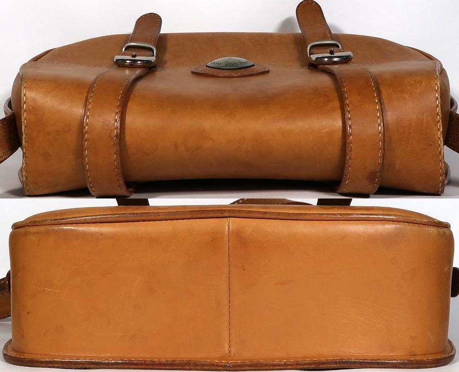 国内の革工房に注文して創ってもらった物だと、もと所有者は言っておりました。厚みのあるしっかりした作りのショルダーバックです。使用品ですしそれなりに年数は経っておりますのでしみ、汚れや擦れあります。部分的には擦り傷もあります。ひどい傷はないです。バックの内側も同様の状態ですが、ひどい傷や目立つような汚れはないです。ポケットはメインのポケットの他に内側にファスナーポケットとバックの背面にサイドポケットがあります。バックのサイズはW35xH27xD10cmくらいです。ショルダーストラップは2段階で調整可能です。ロングサイズだと126~136cmくらいに穴が5個あります。ショートサイズだと100~105cmくらいに穴が3個あります。ストラップの幅は2.3cmくらいです