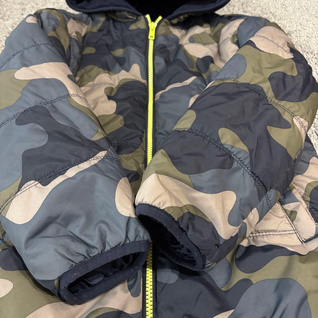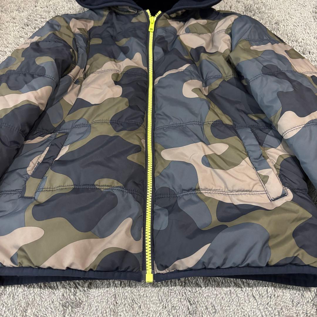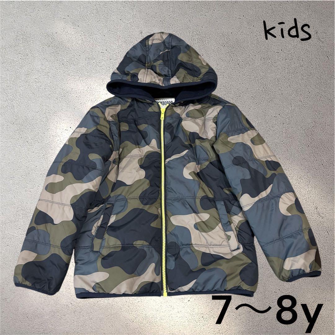フード付きの迷彩柄ジャケット、7〜8歳向け、明るい黄色のジッパーが特徴。
