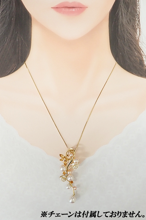 コメントタサキの、大小サイズが異なる優しい色合いの淡水パールが豊かに実りを感じさせる華やかなペンダントトップです。見栄えのあるサイズ感と流れるような曲線のラインが存在感と優美な印象を与えます。中央のダイヤモンド部分が関節のようになっており、動きに合わせてやさしく揺れ動きます。