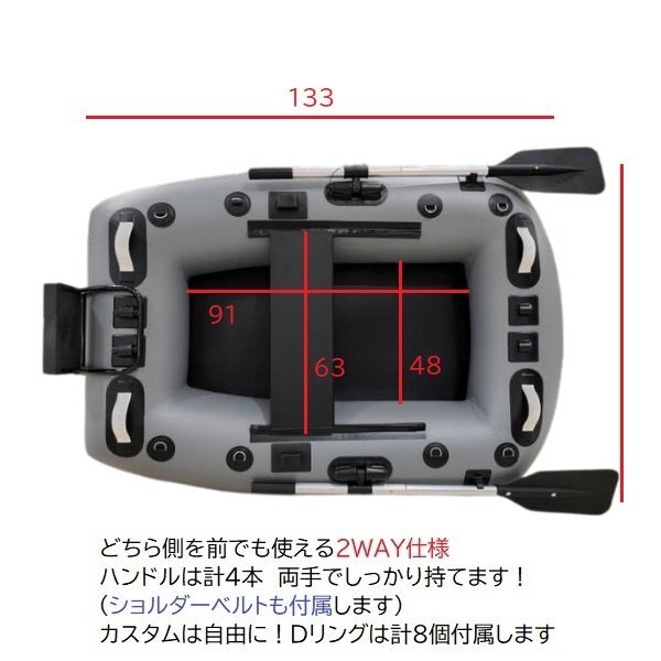 サイズ(cm): 全長158・全幅114・チューブ径33・甲板長91・甲板幅48・アルミシート幅63