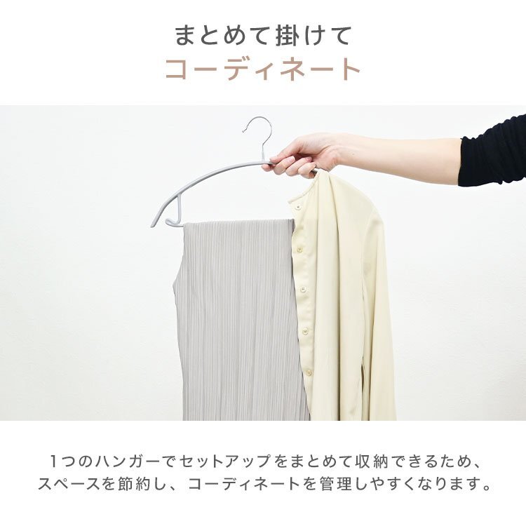 滑らない、型崩れしない! おしゃれで便利な すべらないハンガー です。 下着やキャミソールなどを掛けられるフック、パンツやタオルなどが掛けられるバーを追加し、さらに便利に! セットアップやストールなど、まとめてスッキリ収納できます。 ■滑り止め加工 表面に特殊なPVCコーティング加工を施しているので、滑りにくい構造となっており、衣類をしっかりキャッチします。 襟の開いたブラウスやキャミソール等、滑りやすい素材の洋服にもオススメ! ■型崩れ防止 丸みのある三日月型カーブで、ハンガーの跡がつきにくく、型崩れを防止しキレイな状態でお洋服をキープしてくれます。 跡のつきやすい柔らかいニットにもオススメ! \優れた利便性/ ■固定式で絡まないフック ■スリムなデザインでスッキリ収納! ■丈夫なスチール製で重さ、サビに強い! ■ノーマル・バー付きタイプは耐荷重20kgで、重たい衣類も安心!ジャケットやコート類もしっかり固定! ■乾湿両用としてクローゼット収納・洗濯時にも使用可能。 【商品詳細】 内容:ハンガー 90本 タイプ:バー付きタイプ カラー:グレー サイズ:(約)横42×縦20×厚さ1.2cm 重量:(約)110g(1本あたり) 耐荷重:(約)20kg 素材:PVC、スチール 【注意事項】 ・PVC加工は大変柔らかな素材となっております。 そのため、製造工程や輸送中に若干の凹みや歪みが生じる場合がございます。 ご使用上には問題がありませんので、予めご了承ください。 ・商品は、モニターによって色合いが異なって見える場合があります。 ・仕様・デザインは改良のため予告なく変更することがあります。 |