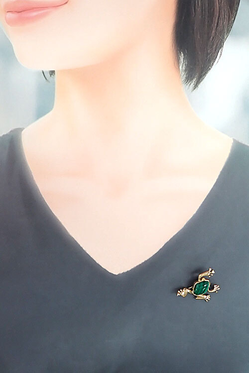 コメントタサキの、マラカイトの縞模様に唯一無二の自然の美しさを感じるブローチです。マラカイトのグリーンカラーと、イエローゴールドで表現されたカエルモチーフが、キャッチーでありながらも気品を漂わせます。