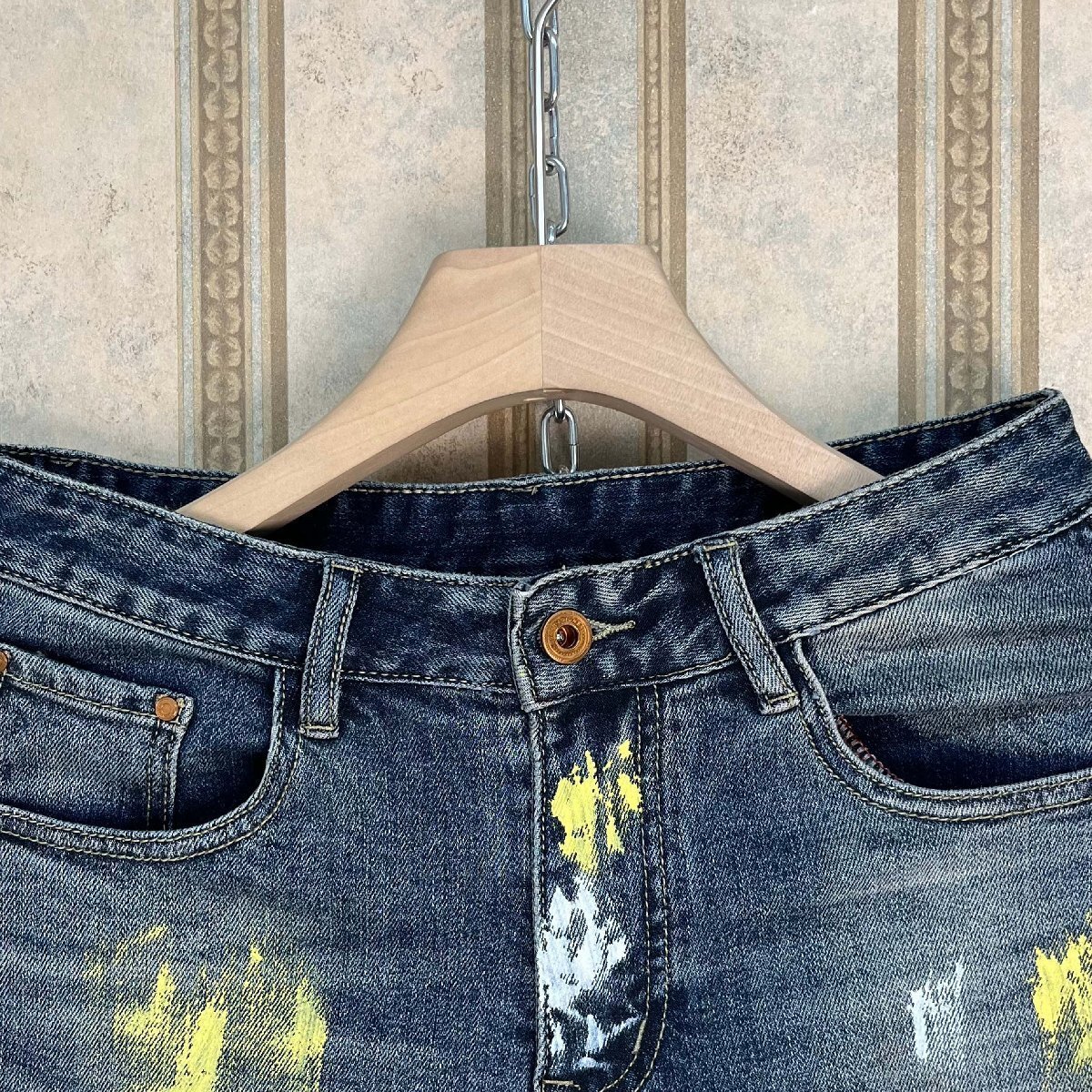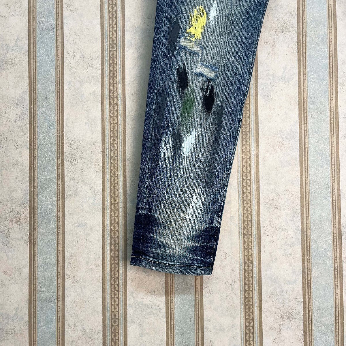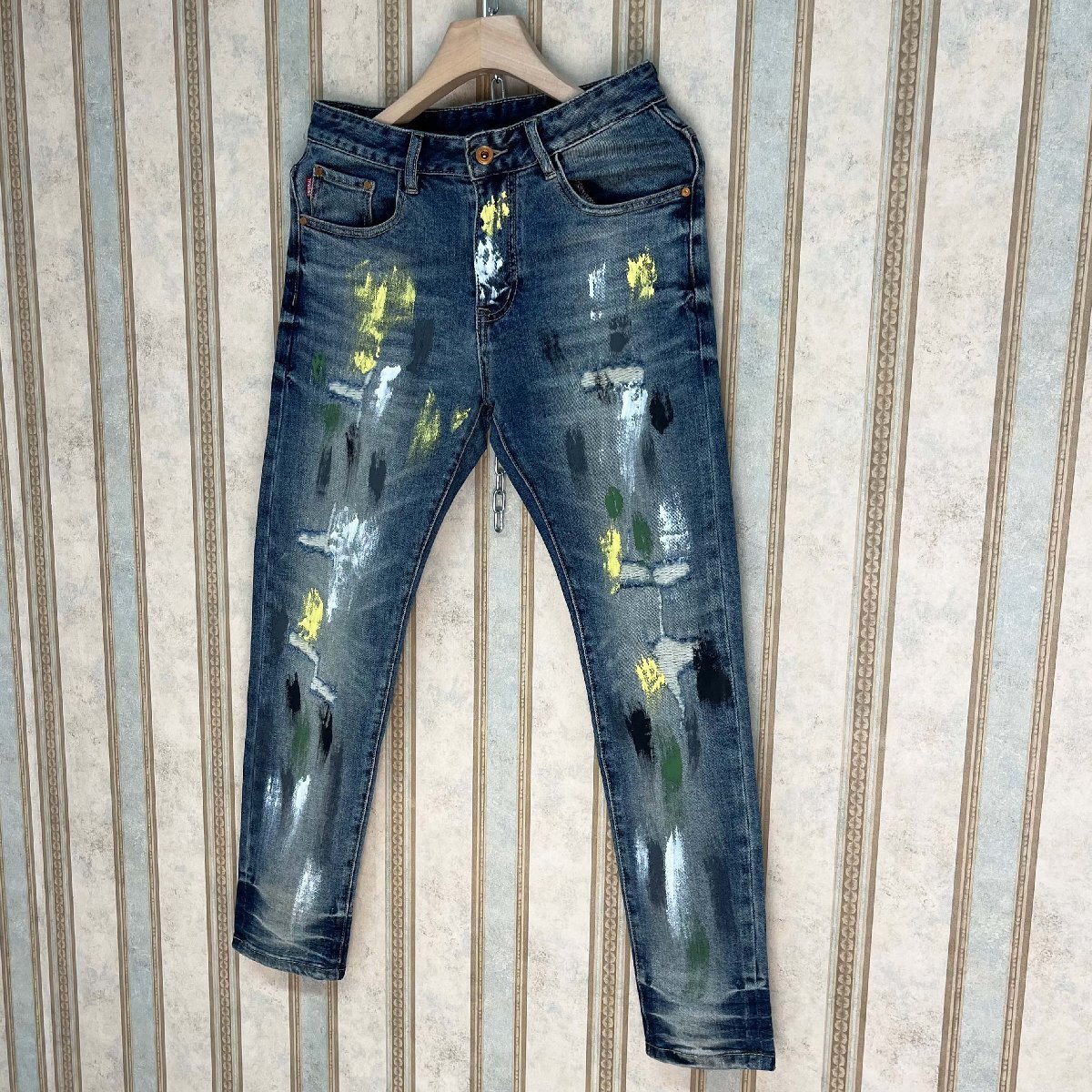 個性 定価4万 FRANKLIN MUSK・アメリカ・ニューヨーク発 デニムパンツ 綿混 上質 ペイント ダメージ ロング丈 ストリート ズボン サイズ32