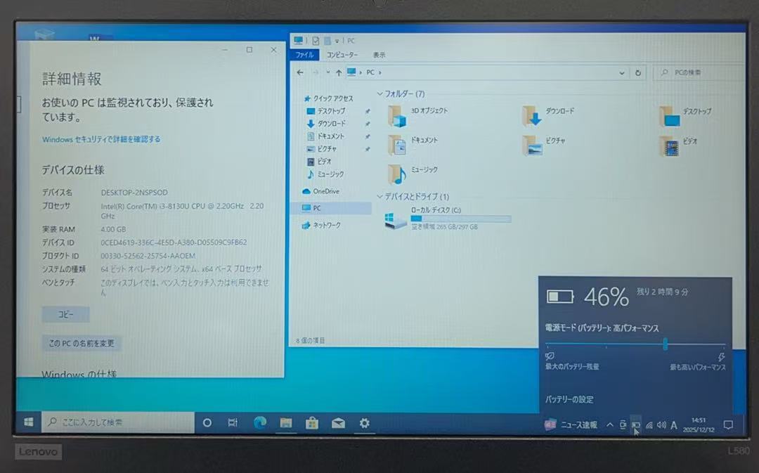 中古ノートパソコン★Windows10★Lenovo ThinkPad Core i3-8130U/@2.20/4GB/HDD 320GB/office 2024/15インチ以上★