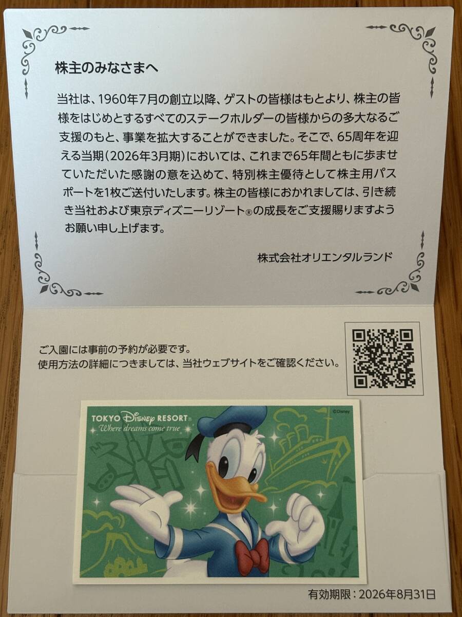 オリエンタルランド 株主優待 1枚 ディズニーランド・シーパスポート 有効期限 2026年8月31日