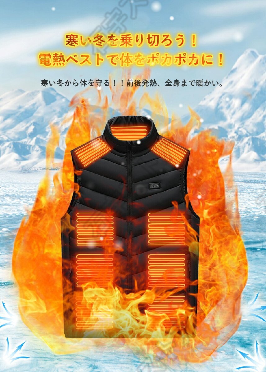 4.ヒーターをお腹、背中、腰、肩の21か所に配置し、素早くベスト内を温めます。