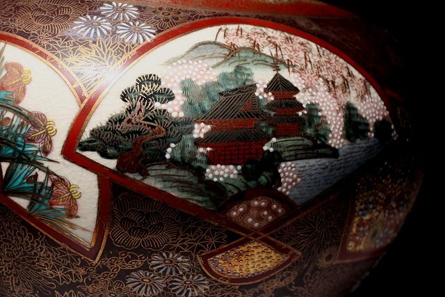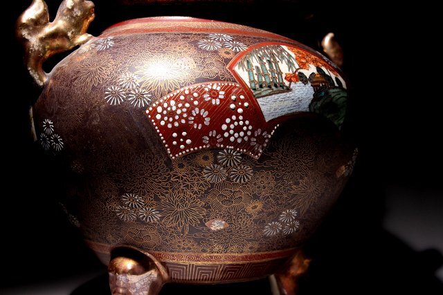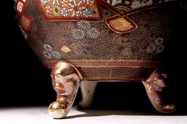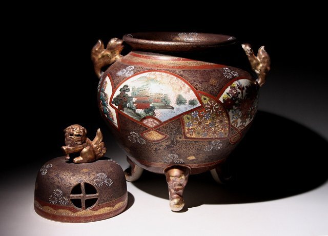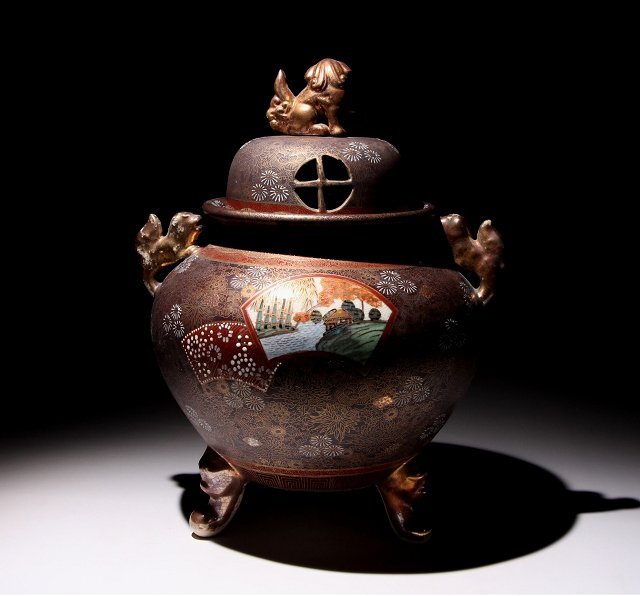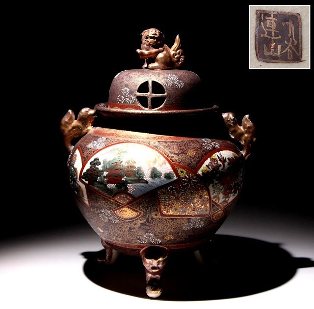 | ◇商品説明◇ | 写真でお分かりのようにとても豪華な九谷焼、九谷連山の金襴手大香炉の出品です。作品は獅子摘、獅双耳が施され、色絵や金彩にて扇面に美しい春秋山水、色鮮やかな草花図が施された見応えのある作品です。状態につきましては、スレ、キズ、ヨゴレ、剥落等がありましたので画像にて御確認の程宜しくお願い致します。