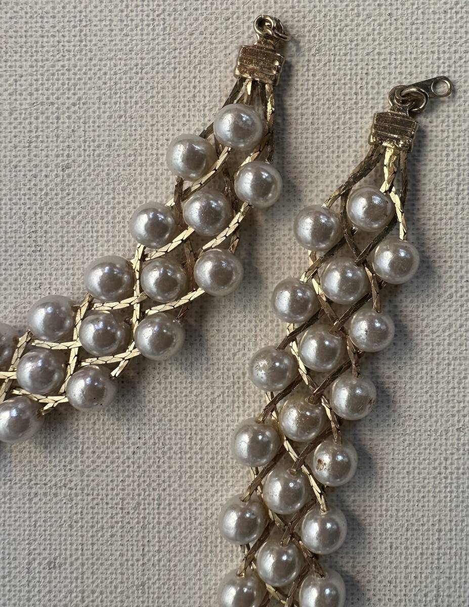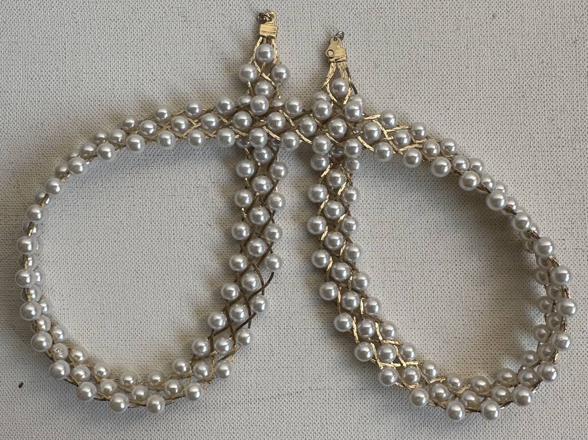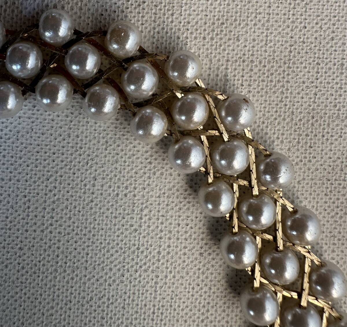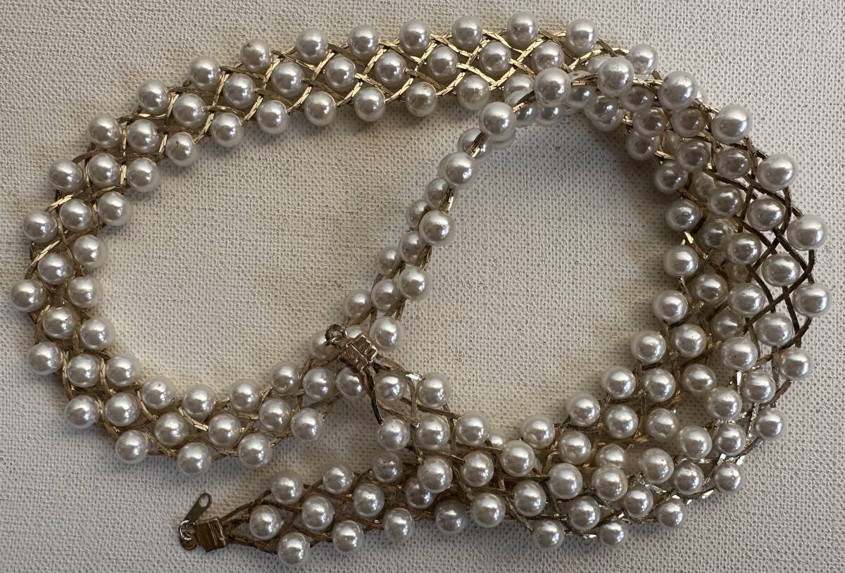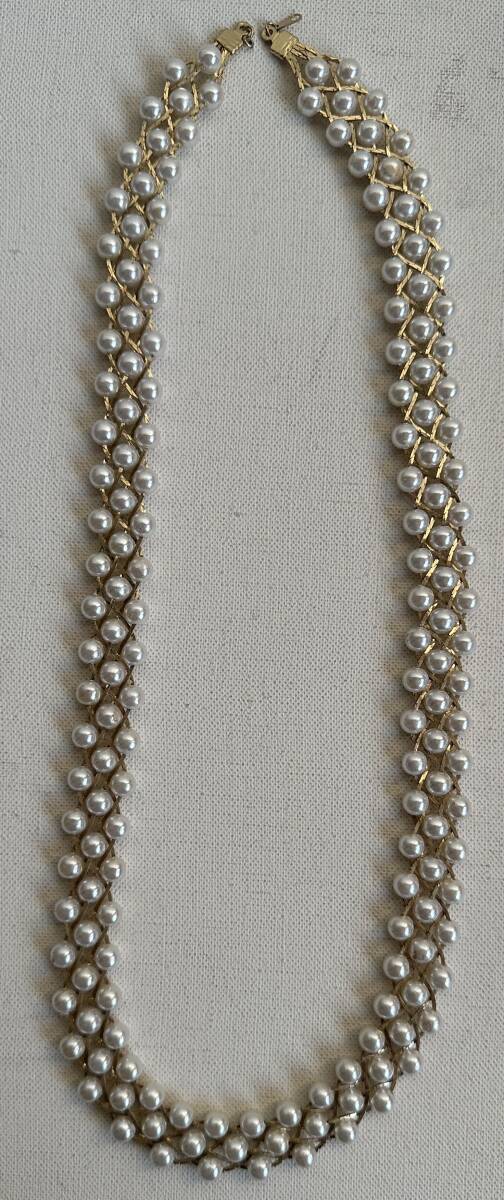 3連束パールネックレス美品ですが難ありです。サイズ:全長61cm。全幅1.8cm。全体的には美品の部類ですが、難ありとは片側の留め具が欠損しております。現状では装着が出来ませんので修復が必要です。ご理解頂ける方のみノークレーム・ノーリターンでお願いします。