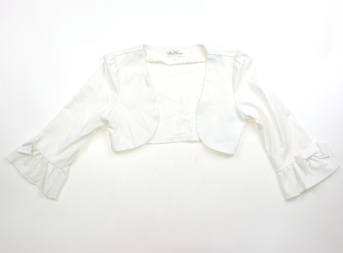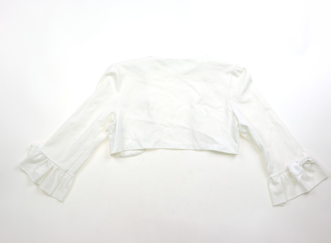実寸は、肩幅約35.7 cm、サイドネックポイントから総丈約27.4 cm、胸囲約44.1cm(×2平置き実寸)、袖丈約42.4cm。実際のサイズ表記はLです。前開きのボレロ。レーヨン・ポリウレタン素材。裏地なし。袖に、小さな引掛け傷あり。使用感はありますが、目立つ汚れはなく、まだまだ活躍してくれそうです。