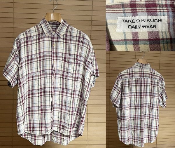 【激安1点のみ 日本製 国内正規品】TAKEO KIKUCHI DAILY WEAR タケオキクチ デイリー ウエア レーヨン 100% チェック柄 半袖 シャツ 3 ボルドー系 USED