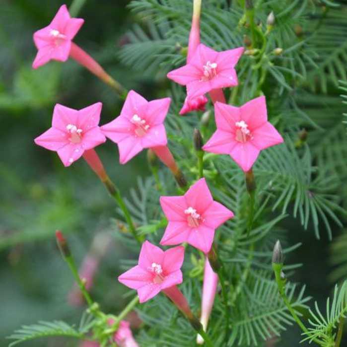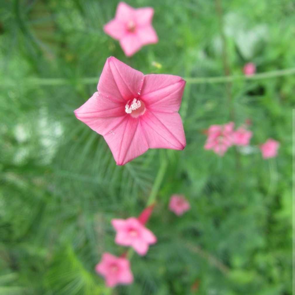 ルコウソウは、直径3cm位、星形の可愛い花でピンクや白の小花が大変愛らしいです。葉は細く羽状で深く切れ込み葉だけでも観賞価値十分です。濃緑色の葉と調和しコントラストも最高です。ツル性で2m以上にも伸び、垣根、アーチ、日除けなどに人気があります。いかがでしょうか?(=^・^=)