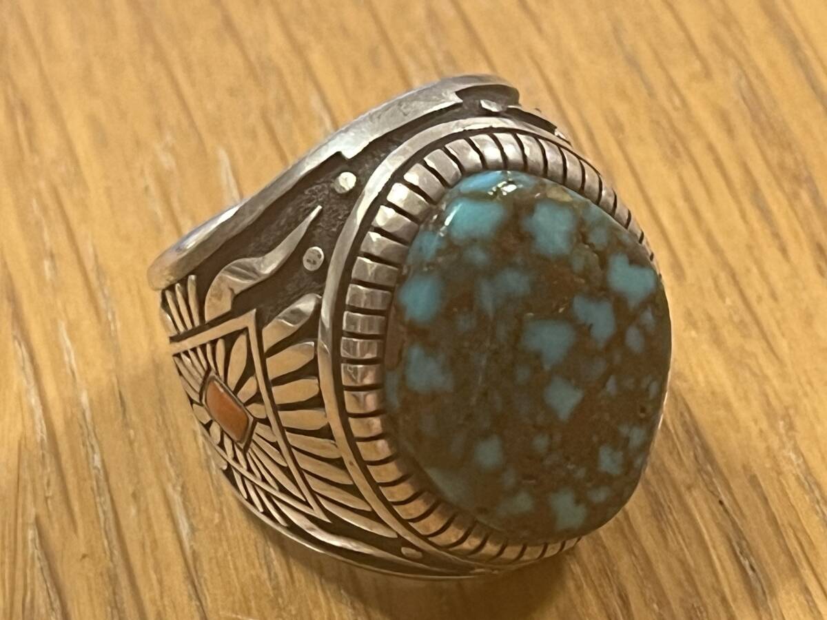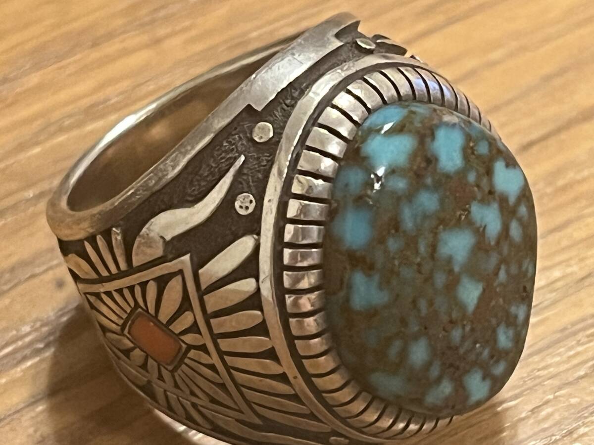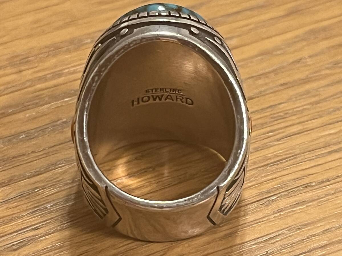 ナバホ族の超人気作家 ハワードネルソン Howard Nelson の大粒ターコイズを配し、オーバーレイでケトーをデザインした、ハワードネルソンの代表的なリングです。
