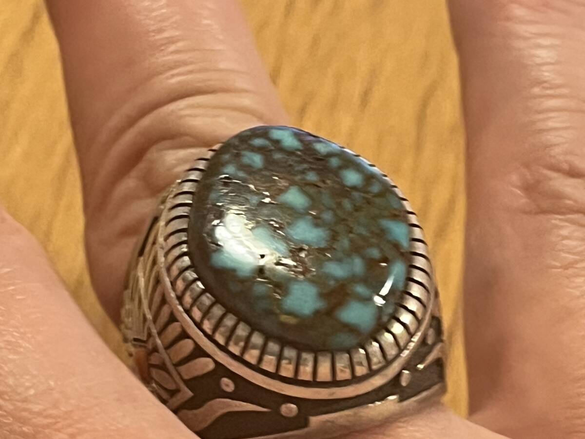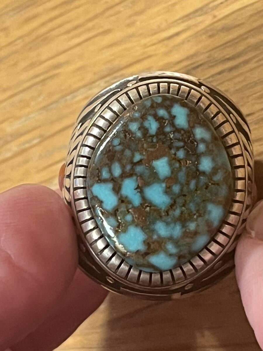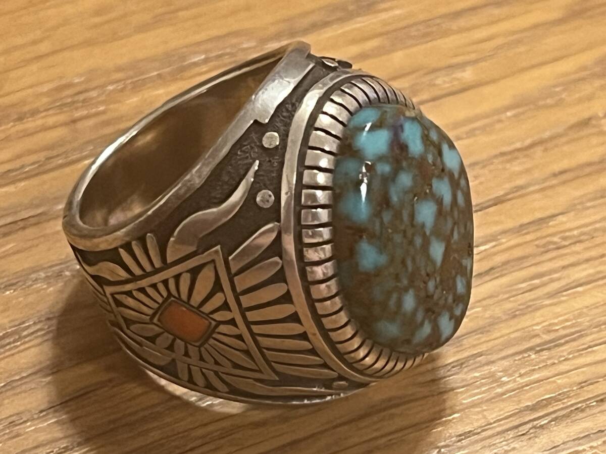 ナバホ族の超人気作家 ハワードネルソン Howard Nelson の大粒ターコイズを配し、オーバーレイでケトーをデザインした、ハワードネルソンの代表的なリングです。