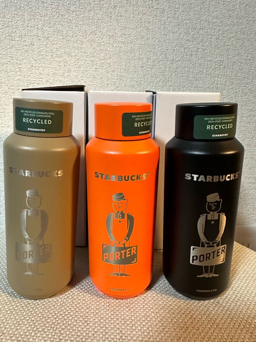 ボトル前面には、バリスタのエプロンを身につけたポーターくんをデザイン。ボトルの背面には型押しのサイレンが入っています。