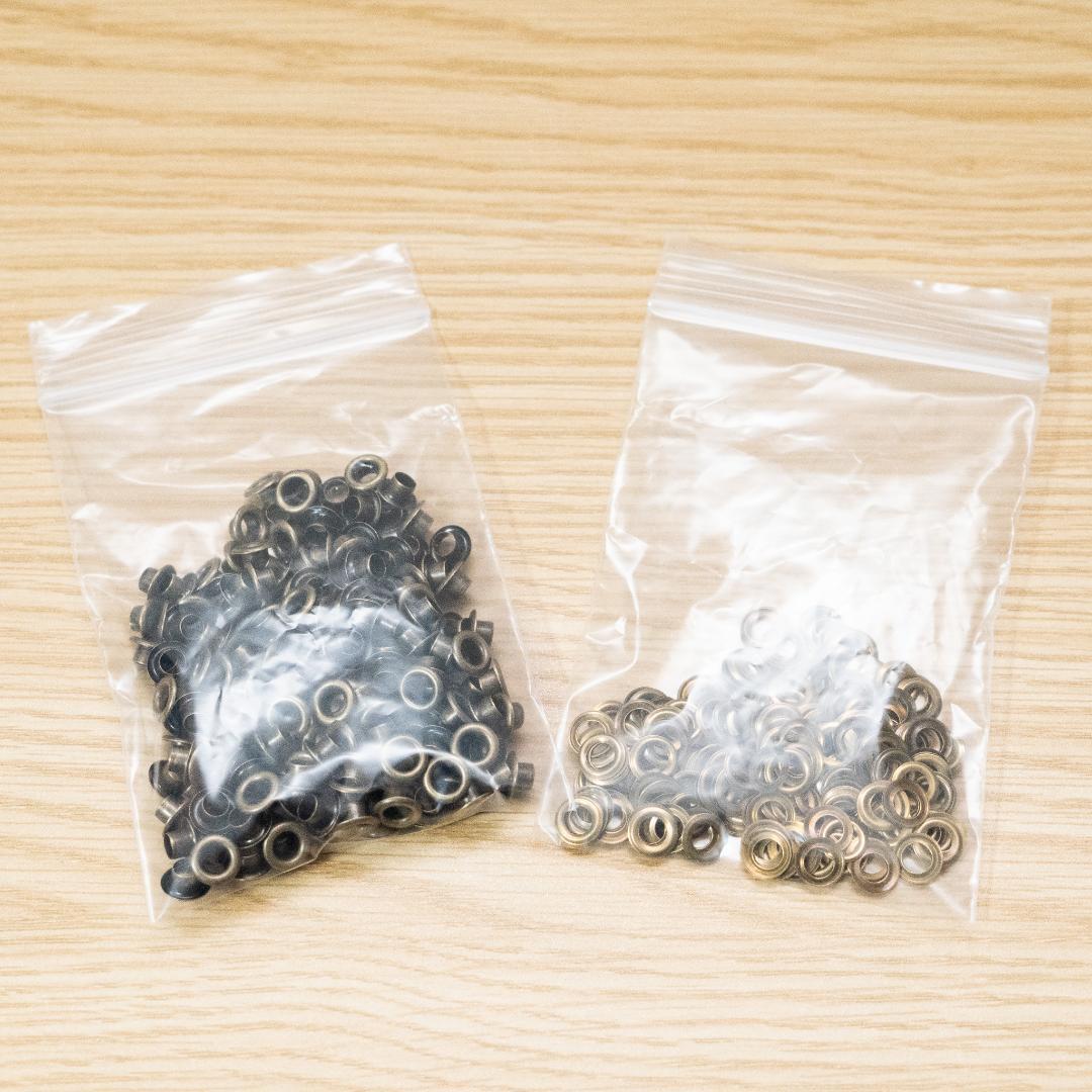 特にハトメの「高さ」については、取り付ける物の合計の厚みにプラス+2mm3mmした高さを持つハトメを選ばなければ止まりません。