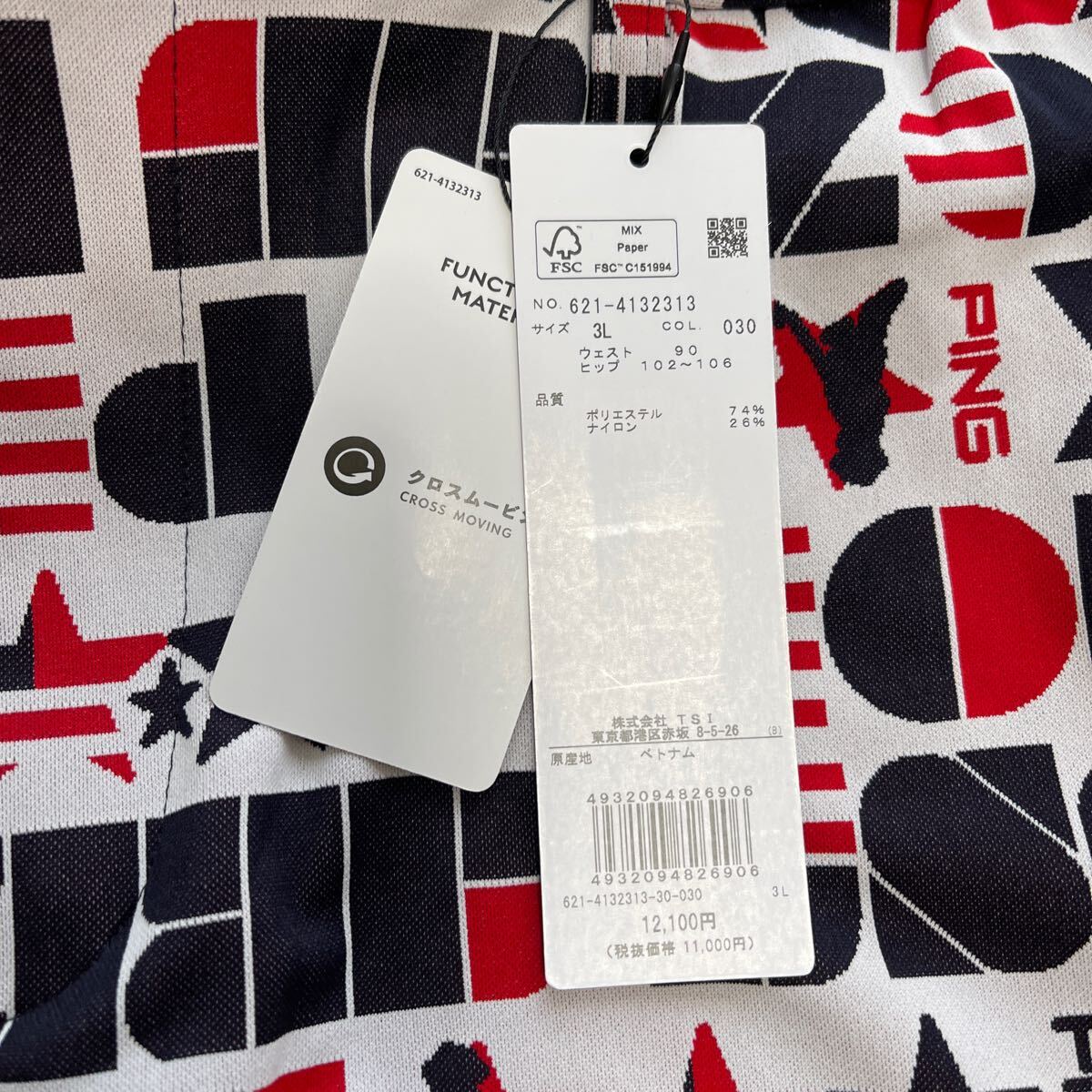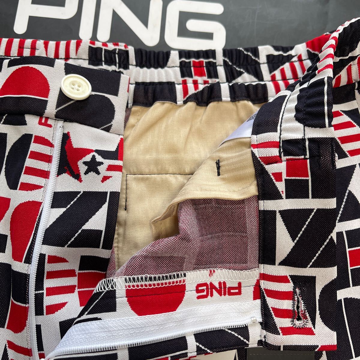 ビッグサイズ(3L)ウエスト88-92cm/ヒップ102-108cm(メーカー参照)ウエスト43cm〜(サイドから幅広ゴムストレッチ加工)ヒップ110cm/股上29.5cm/股下23.5cm/ワタリ幅37cm/素材ポリエステル.ナイロン製/凸凹鹿の子通気性速乾柔らか軽量ライト素材/CROSSMOVING全方向伸縮快適ストレッチ素材/開閉部:ロゴボタン+ジッパー/ベルトループ付/ポケット×5/トリコロールカラーUSA ARIZONA Mr.PINGモチーフ+PINGランダムロゴ編地柄ジャカード加工+PING Since1959ロゴワッペン付+定番ターゲットマーク刺繍加工/内側最新TSI識別タグ付/直営店春夏希少完売サイズ大特価商品(定価12,100円税込)宜しくお願い致します。写真撮影での色合いが遮光率により実際の色と異なる場合が有ります。予めご了承願います(((価値観の相違など回避の為ピンゴルフ商品に不慣れな方や色合いが特に気になる方はご遠慮下さい)))最終お取引受取連絡完了可能な方でのご落札をお願い致します。