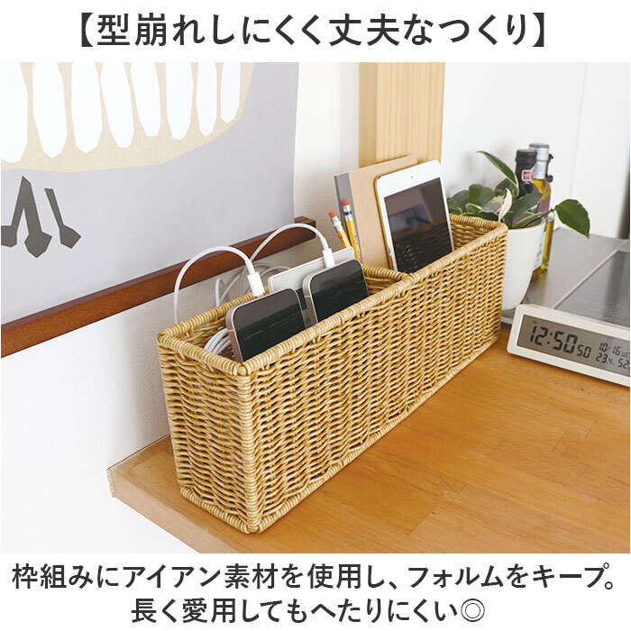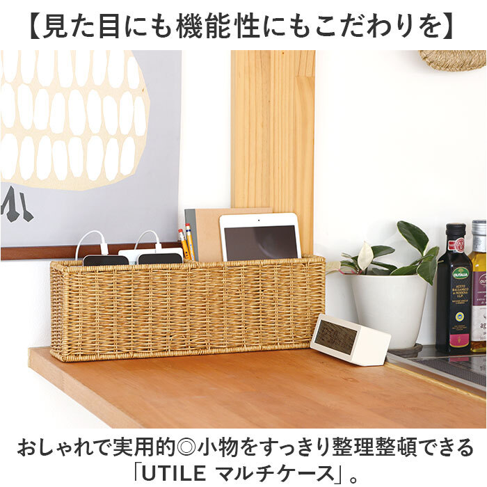 | 商品説明 | ・・【見た目にも機能性にもこだわりを】 ・おしゃれで実用的◎小物をすっきり整理整頓できる「UTILE マルチケース」。 ・【天然素材のようなナチュラル感】 ・ポリプロピレンとポリエチレンを使って手編み。生活感が出にくく置いておくだけでサマになる! ・【水に強く、濡れても大丈夫】 ・天然素材のようにカビや虫、湿気を気にする心配なし。水拭きや水洗いできてお手入れ簡単。 ・(※1)濡れた状態で放置しないでください。 ・【型崩れしにくく丈夫なつくり】 ・枠組みにアイアン素材を使用し、フォルムをキープ。長く愛用してもへたりにくい◎ ・【ちょっとした隙間を有効活用】 ・壁際やカウンター上など、スペースの限られた場所にも置きやすいスリム設計。見せる収納に♪ ・【自宅の色んな場面で使えて万能】 ・キッチンの調味料や小皿、ルームシューズや掃除グッズ収納。スマホなどの充電ステーションに! ・(※2)縦横両用タイプです。 ・【どんな空間にも素敵にマッチ】 ・飽きが来ず、空間に馴染むデザイン♪お気に入りのアイテムで、お家時間をより豊かに。 |