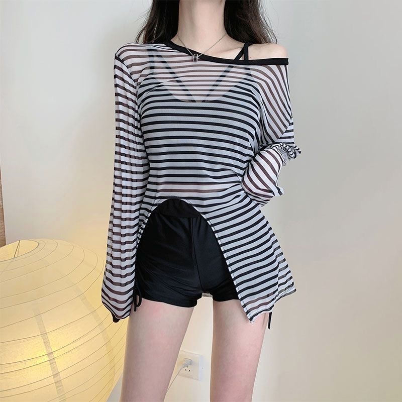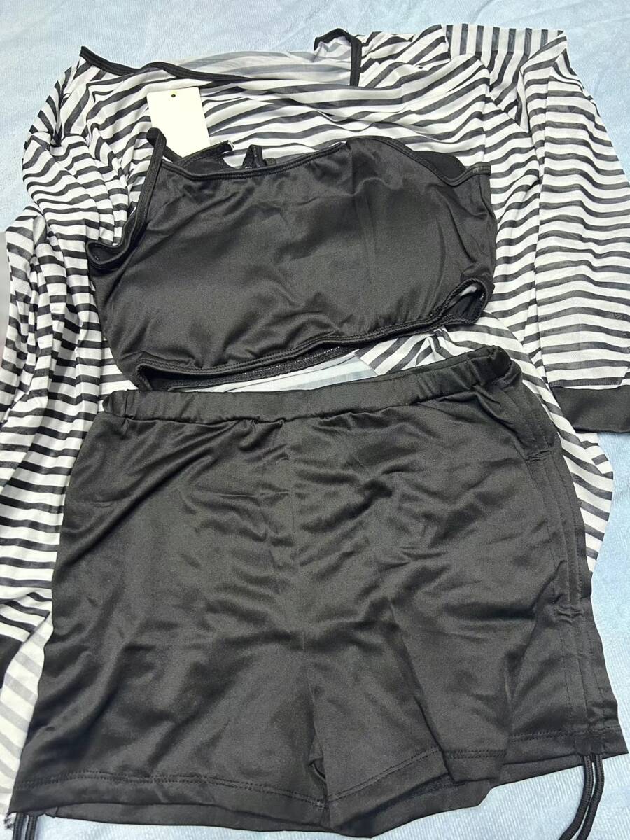 お洒落に体型カバー3点セットレディース水着です。レディース 水着 タンキニ 3点セット です。大人気大人可愛いブラックボーダー上下3点セット温泉 ビーチ リゾート 海 川 などお勧めです。
