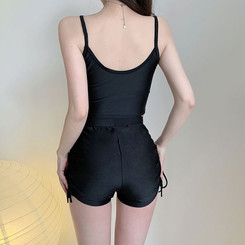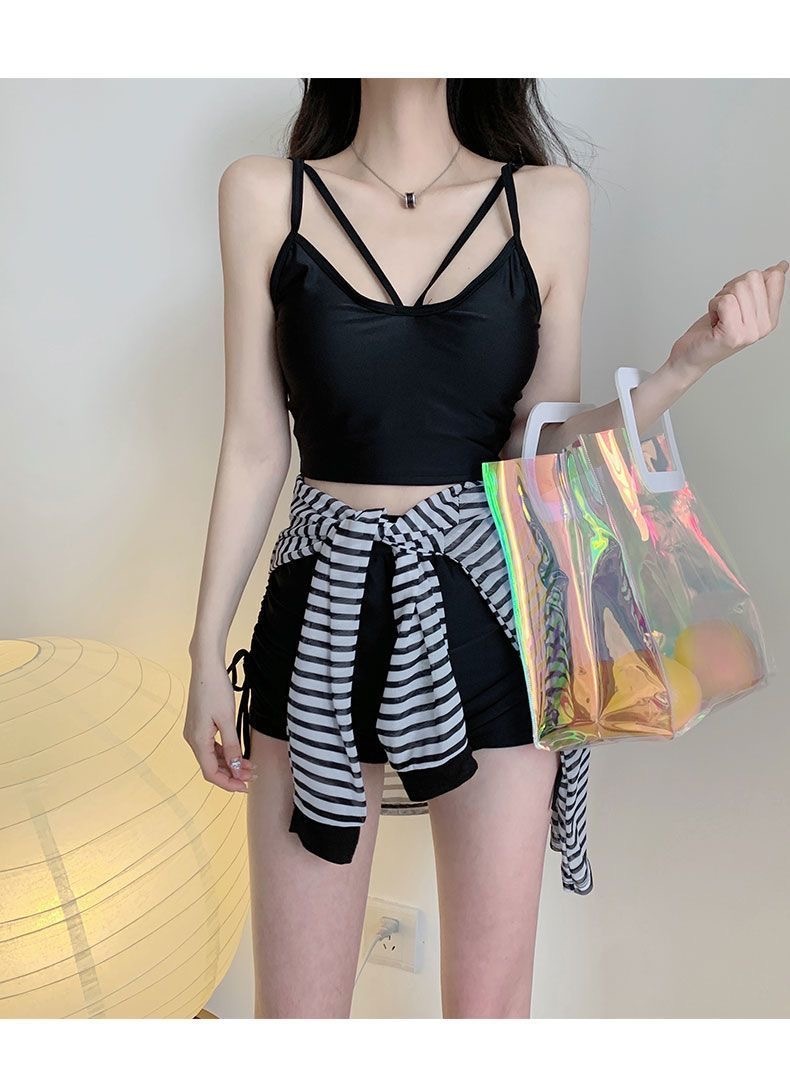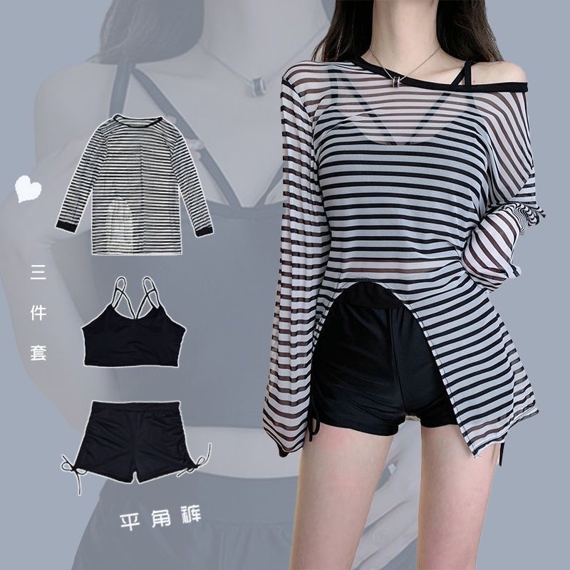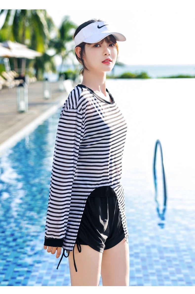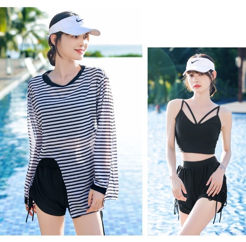 お洒落に体型カバー3点セットレディース水着です。レディース 水着 タンキニ 3点セット です。大人気大人可愛いブラックボーダー上下3点セット温泉 ビーチ リゾート 海 川 などお勧めです。