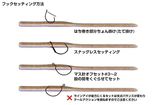 現状、多くのストレートワームが存在し、多様なリグに対応できる汎用性のあるデザインがされている。しかし、ことネコリグ、しかも喰わせだけにフォーカスすると専用設計されたストレートワームの必要性にいきついた。あえてネコリグ専用設計にすることで寄せと喰わせ性能を圧倒的戦力にまで昇華させた、次世代ネコリグの新スタンダードである。