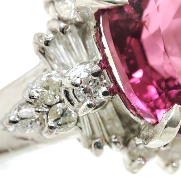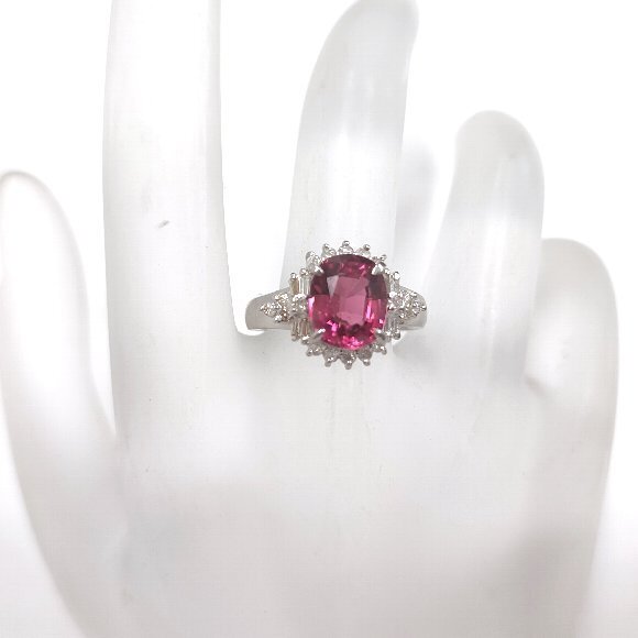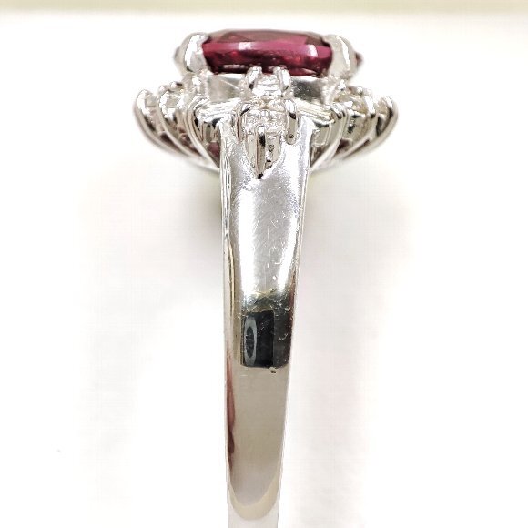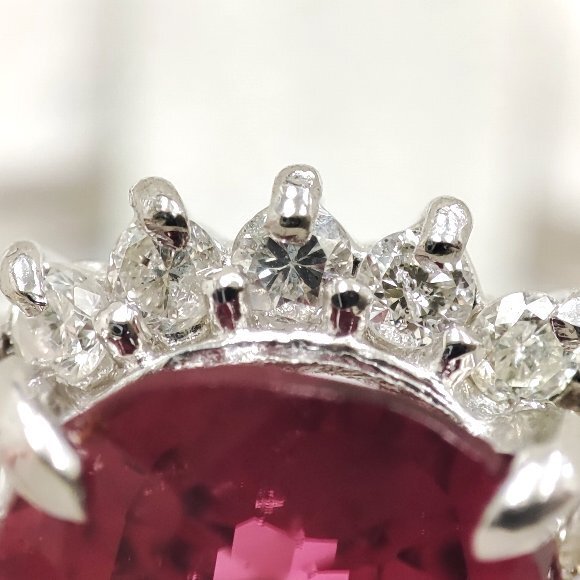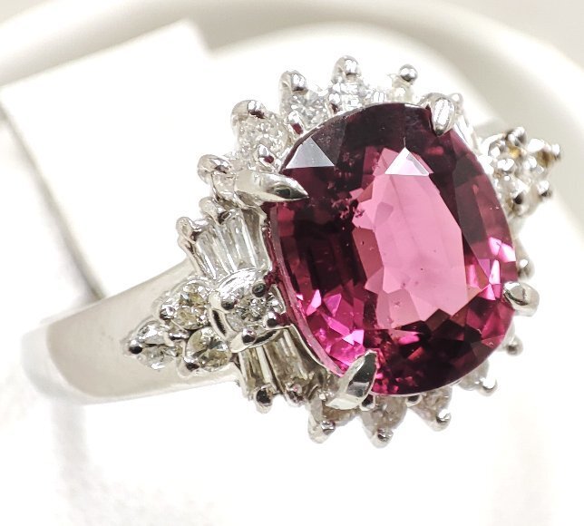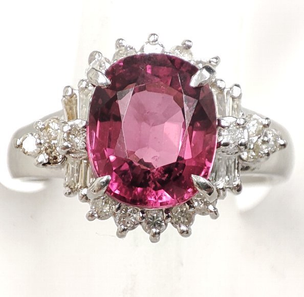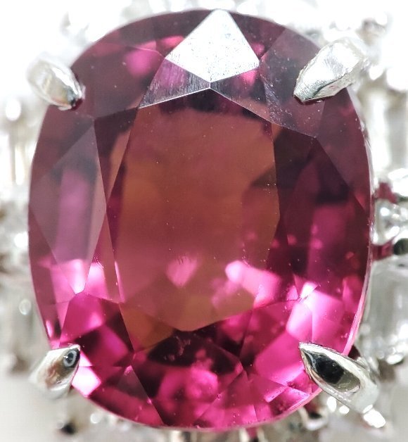 2.35カラット オーバルミックスカットの天然トルマリンをセンターにセットし、合計 0.35カラット テーパーカットとラウンドカットの天然ダイヤモンドを取り巻き石留めしたリングです。トルマリンは少々のインクルージョンは確認できますが 赤紫色のお色が鮮やかで大変綺麗です。ダイヤモンドのクラリティは主観になりますが、SIクラスから Iクラスになります。輝きは有りまずまず綺麗です。リングサイズは、14号で素材は、プラチナ900です。 |