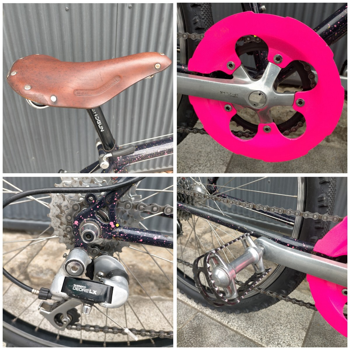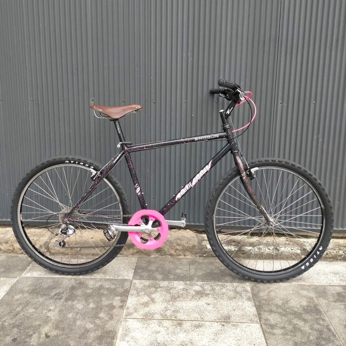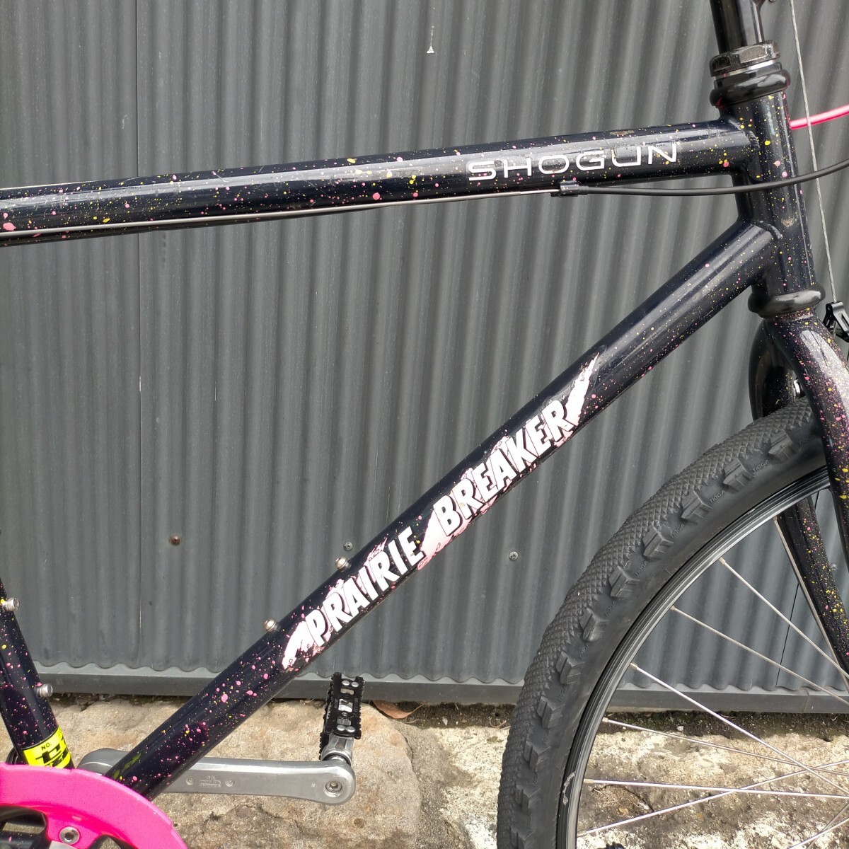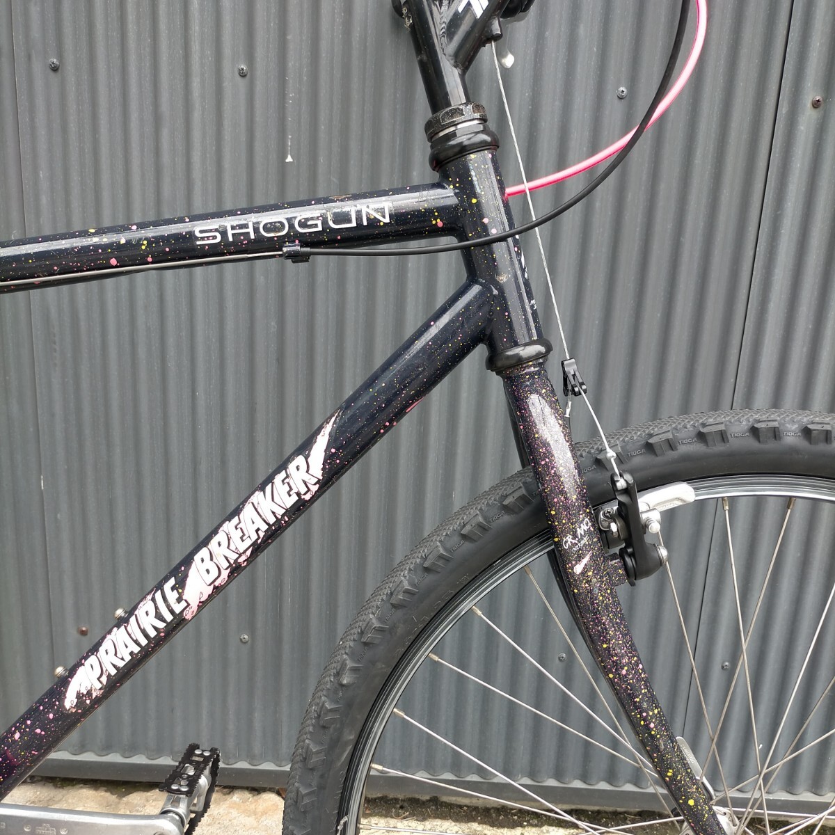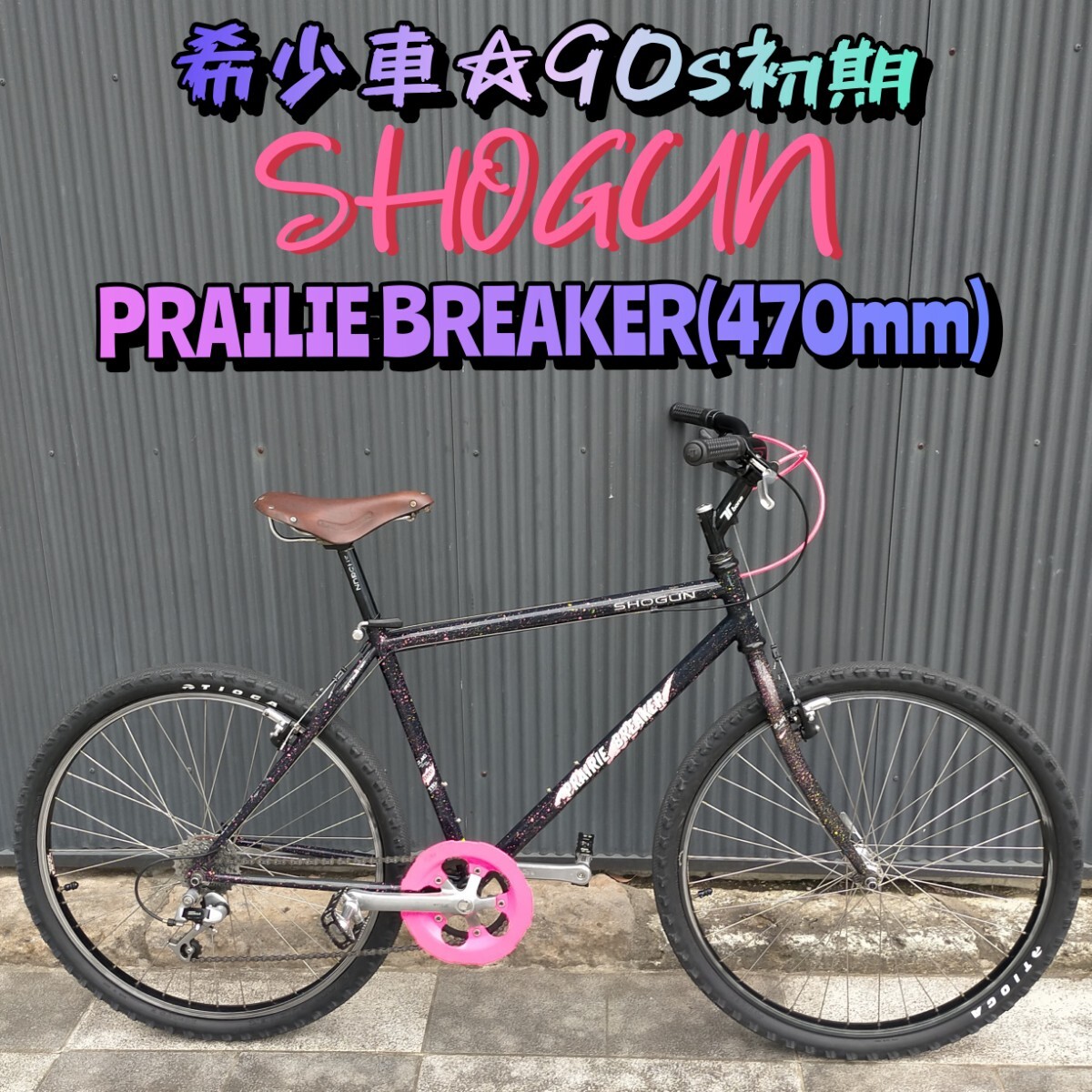 90年代初期のSHOGUNのPRAIRIE BREAKERです。和訳すれば『草原を切り裂く者』ですかね。当時、国内向けはごく僅かで主に北米向けに販売されていたモデルです。国内では中々見当たらないレアな車体です。フレームのスプラッターペイントがお洒落でピンクのアクセントを付けた良いカスタム出来たかと思います。費用・時間(7.5万円以上・約15時間)かけました。デッドストック・ビンテージ・新品パーツ多数使ってます。詳細は下記をご確認下さい。